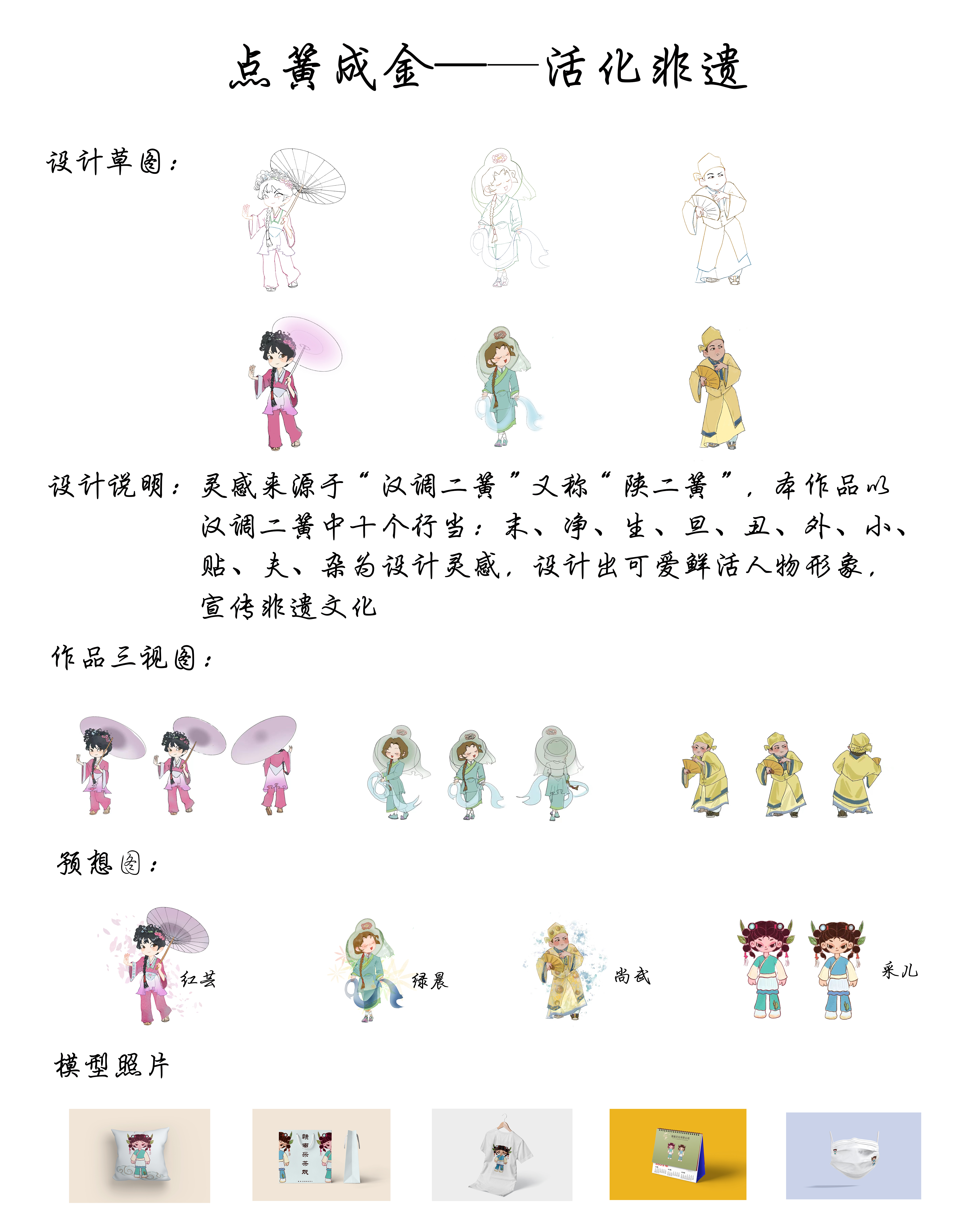 本项目以“汉调二簧”又称“陕西二簧”濒危剧中中的十个行当:末、净、生、旦、丑、外、小、贴、夫、杂为灵感,设计可爱生动的IP化人物形象,并设计相应的文创产品,以此吸引大众的目光,扩大深度和广度的宣传非遗文化,解决汉调二簧的濒危局面。