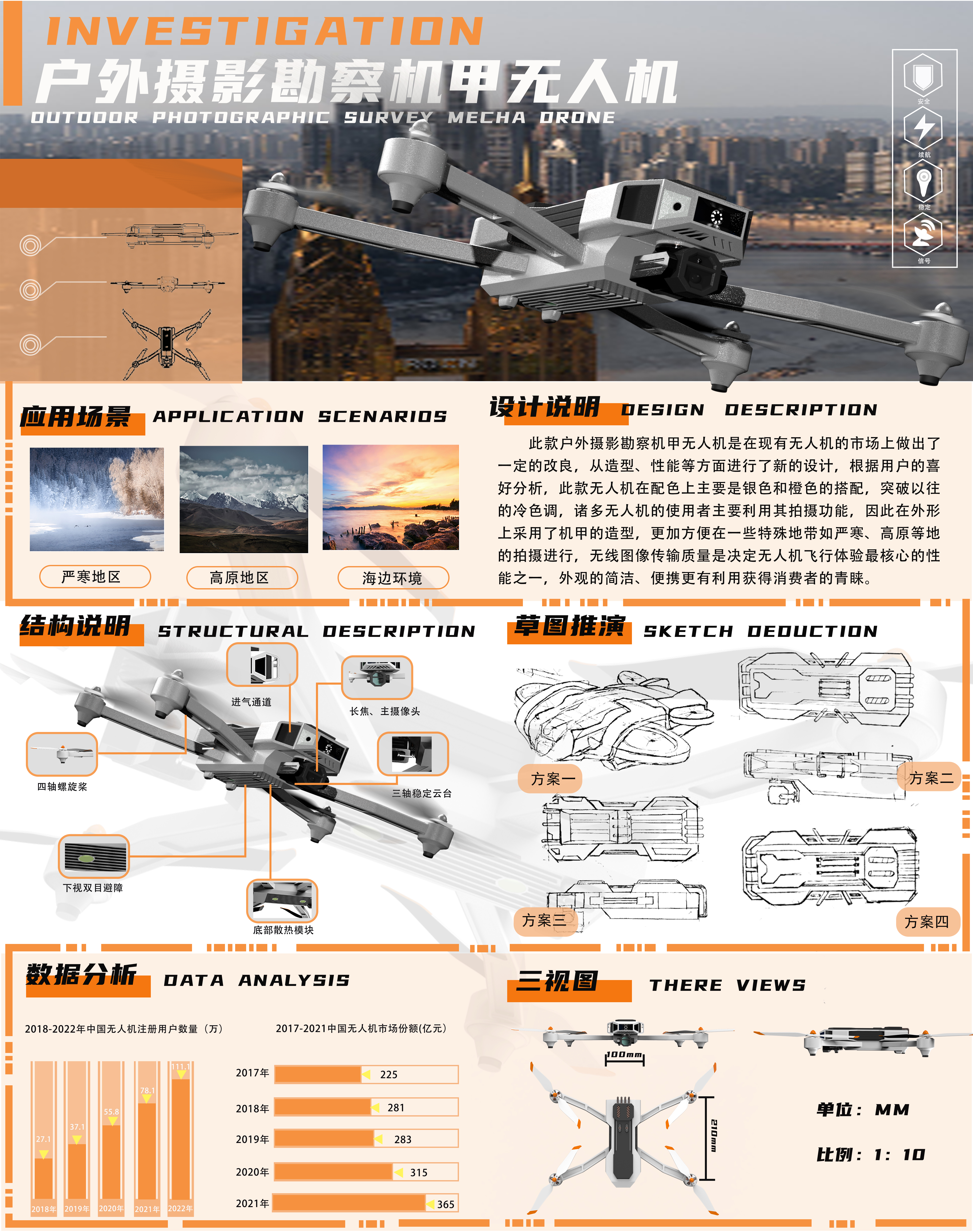 此款户外摄影勘察机甲无人机是在现有无人机的市场上做出了一定的改良,从造型、性能等方面进行了新的设计,此款无人机在配色上主要是银色和橙色的搭配,突破以往的冷色调,诸多无人机的使用者主要利用其拍摄功能,因此在外形上采用了机甲的造型,更加方便在一些特殊地带如严寒、高原等地的拍摄进行,无线图像传输质量是决定无人机飞行体验最核心的性能之一,外观的简洁、便携更有利用获得消费者的青睐。