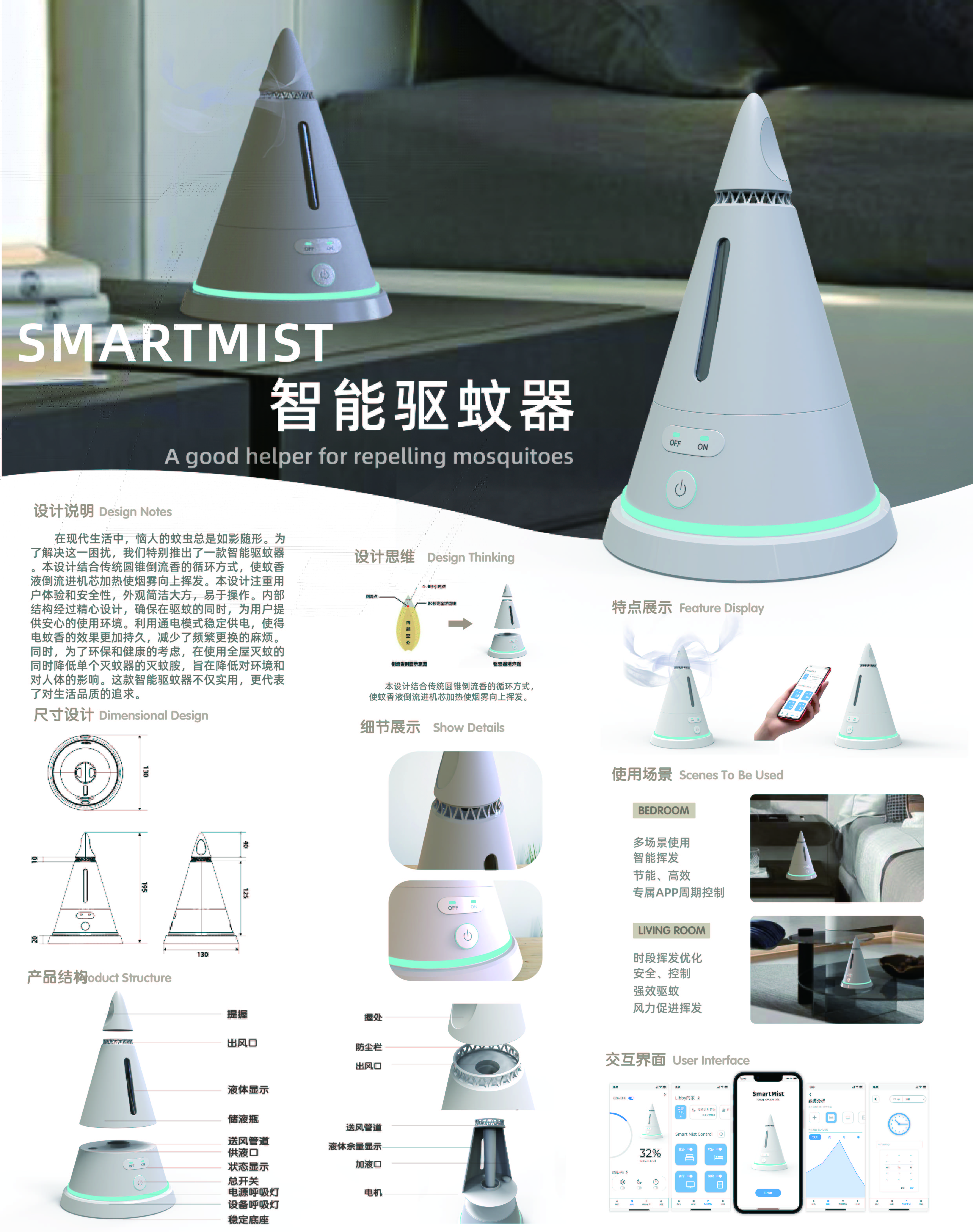 本产品外观上呈圆锥形,体积轻巧,整体外壳采用环保材质制成。功能上,我们特别增加了周期性挥发功能,使得在蚊虫高活跃的时段,如黄昏与黎明,挥发强度增加,提供最佳保护,用户可以通过APP来操作其定时功能,一键开启全屋灭蚊。为了强化驱蚊效果,内置了一个微型风扇,以增加空气流动并帮助液体更快挥发。用户可以并调整风扇的风速。本产品整体设计旨在结合现代科技与环保理念,提供给用户持久、离效的驱蚊保护。
