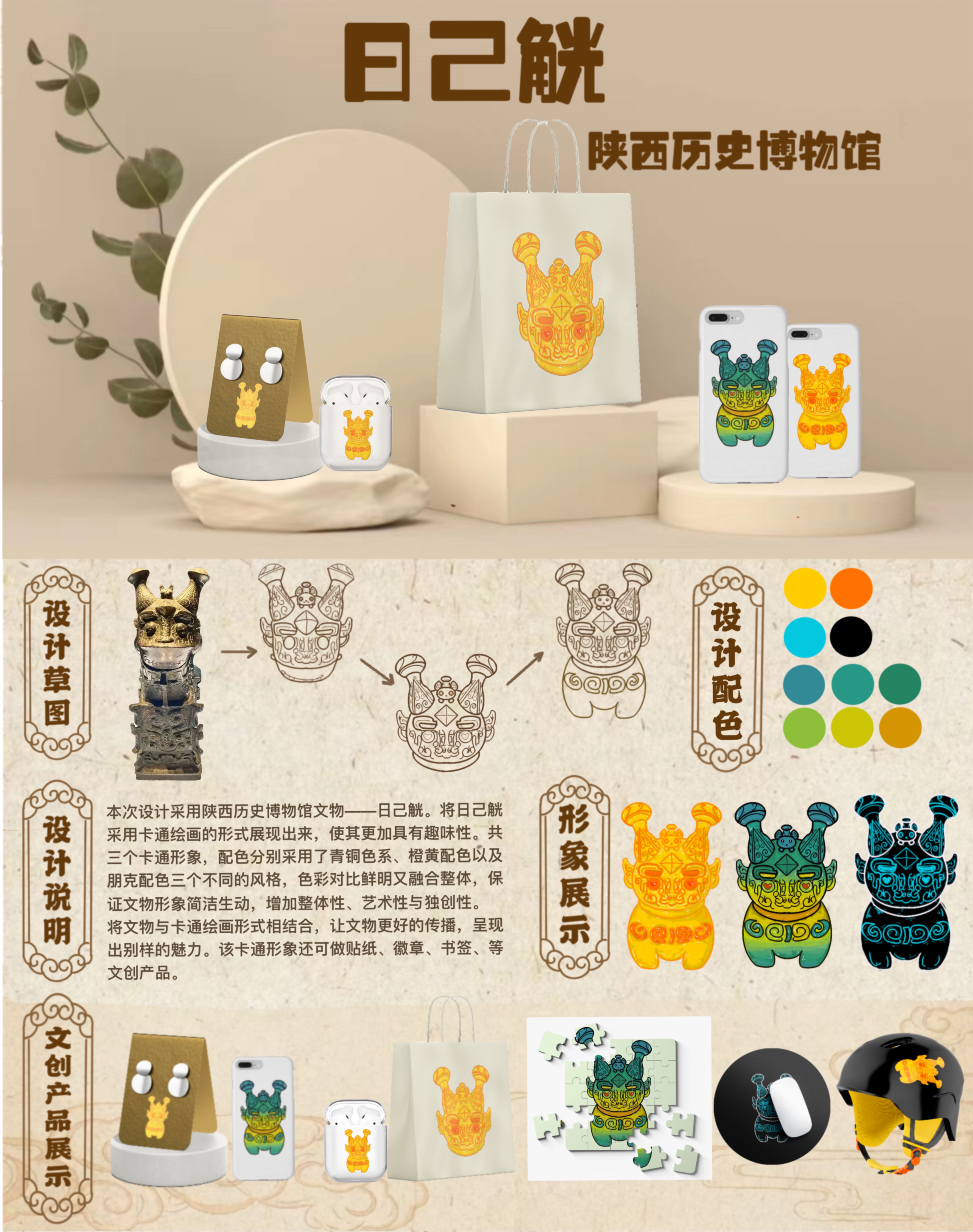 本次设计采用陕西历史博物馆文物——日己觥。将日己觥采用卡通绘画的形式展现出来,使其更加具有趣味性。共三个卡通形象,配色分别采用了青铜色系、橙黄配色以及朋克配色三个不同的风格,色彩对比鲜明又融合整体,保证文物形象简洁生动,增加整体性、艺术性与独创性。 将文物与卡通绘画形式相结合,让文物更好的传播,呈现出别样的魅力。该卡通形象还可做贴纸、徽章、书签、等文创产品。
