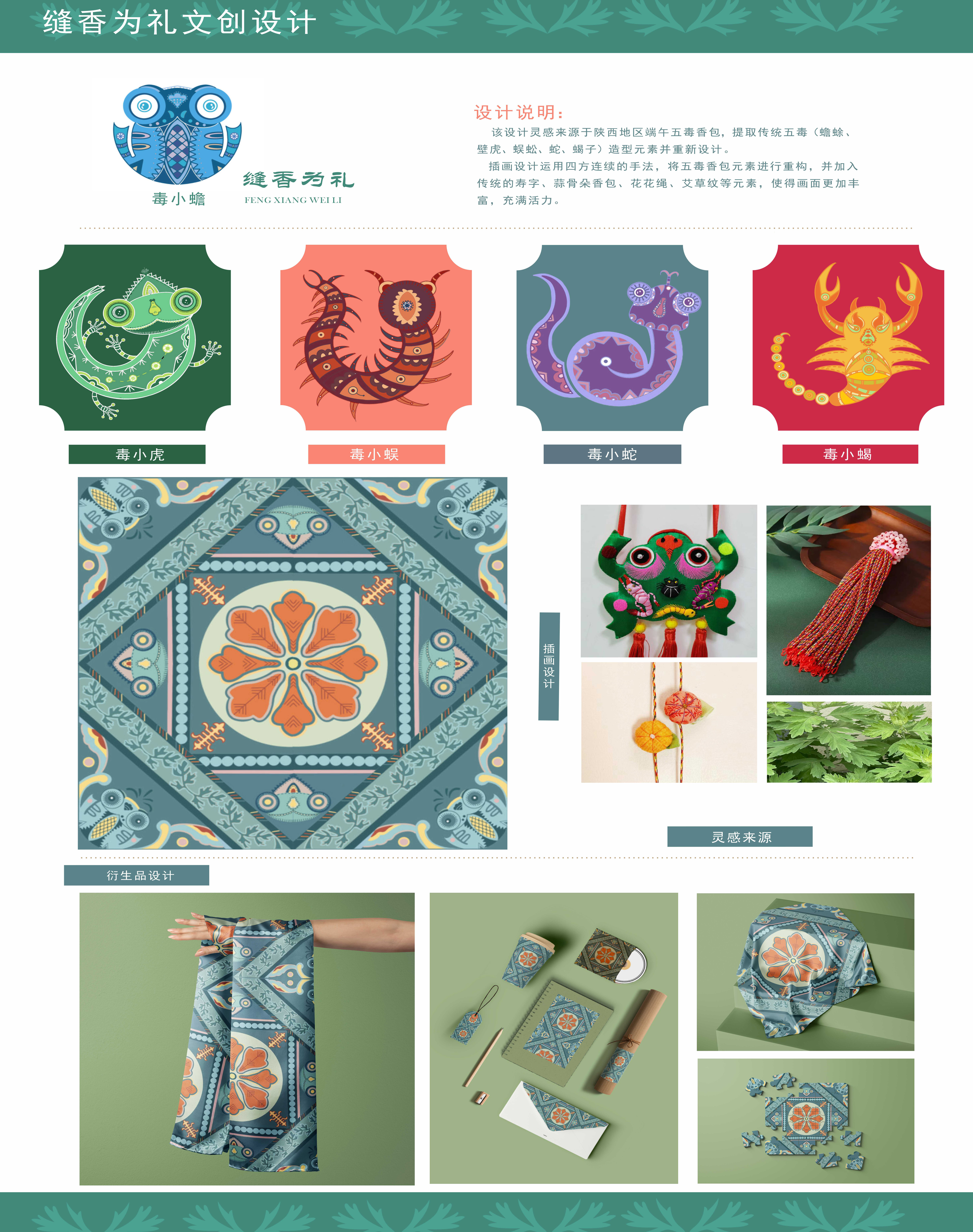 该设计灵感来源于陕西地区端午节五毒香包,通过提取传统五毒(蟾蜍、壁虎、蜈蚣、蛇、蝎子)造型进行重新设计,分别以蓝色、绿色、橙色、蓝绿色、红色来代表五毒的性格。插画设计运用四方连续的方法,将五毒香包元素进行重构,同时加入传统寿字、蒜骨朵香包、花花绳、艾草纹等元素,使得画面更加丰富有活力。