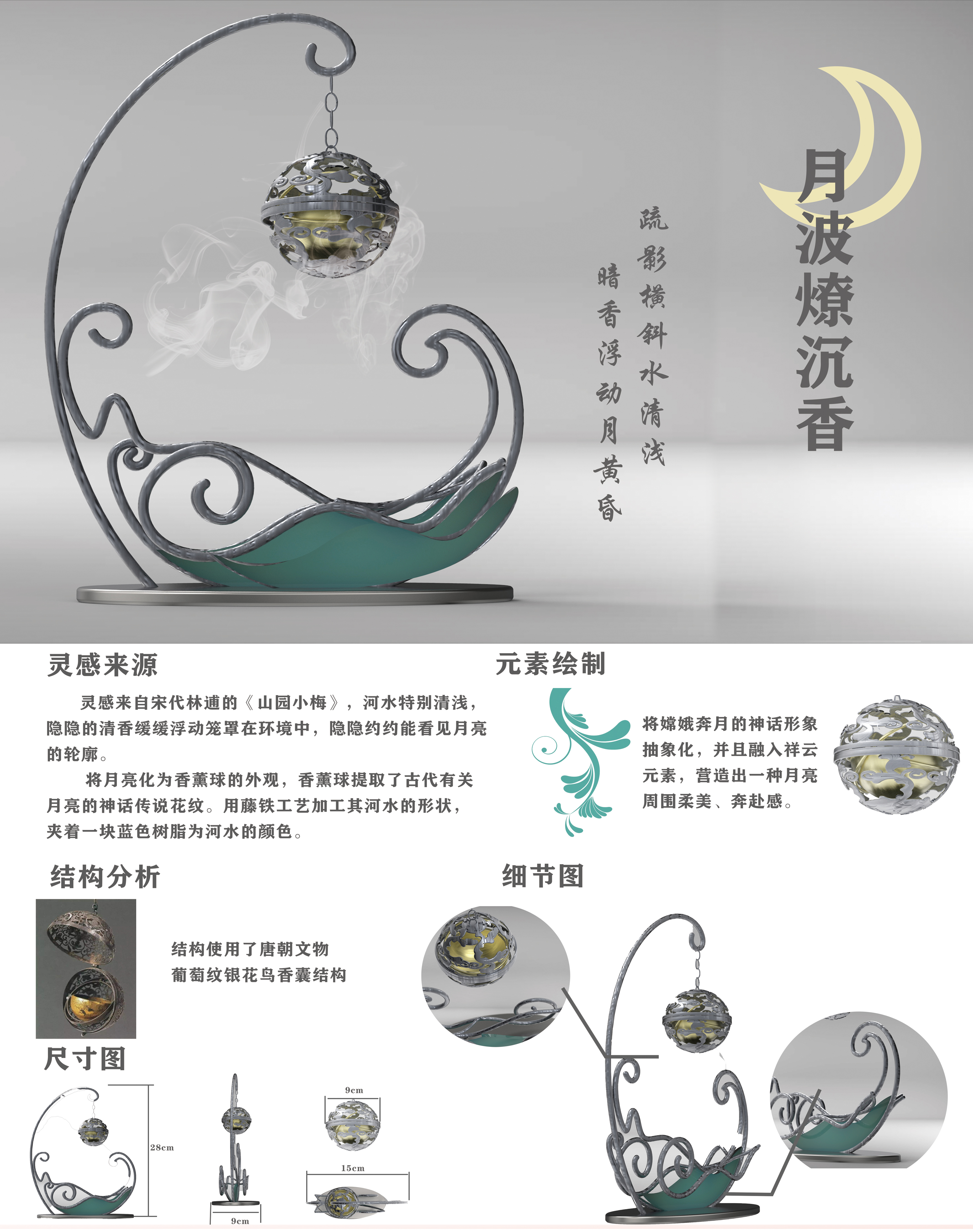 本产品设计灵感来自宋代林道的《山园小梅》,河水特别清浅,隐隐的清香缓缓浮动笼罩在环境中,隐隐约约能看见月亮的轮廓。本设计原型为唐朝文物——葡萄纹银花鸟香囊结构,在此之上,将月亮化为香薰球的外观,香薰球提取了古代有关月亮的神话传说花纹。用藤铁工艺加工其河水的形状,夹着一块蓝色树脂为河水的颜色。使得本文创产品具有韵味,并兼具古典美与实用性。