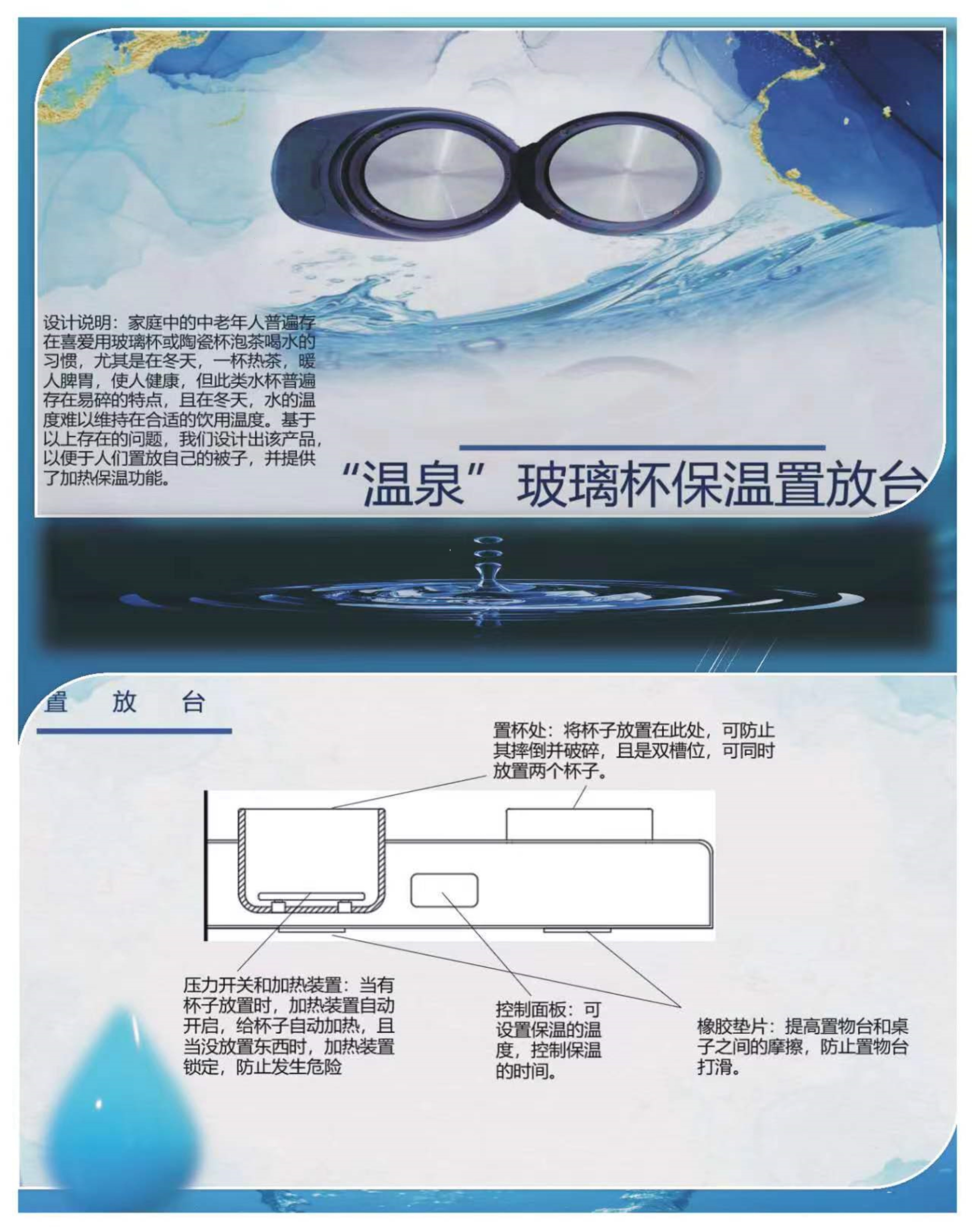 家庭中的中老年人普遍存在喜爱用玻璃杯或陶瓷杯泡茶喝水的习惯,尤其是在冬天,一杯热茶,暖人脾胃,使人健康,但此类水杯普遍存在易碎的特点,且在冬天,水的温度难以维持在合适的饮用温度。基于以上存在的问题,我们设计出该产品以便于人们置放自己的杯子,并提供了加热保温功能。