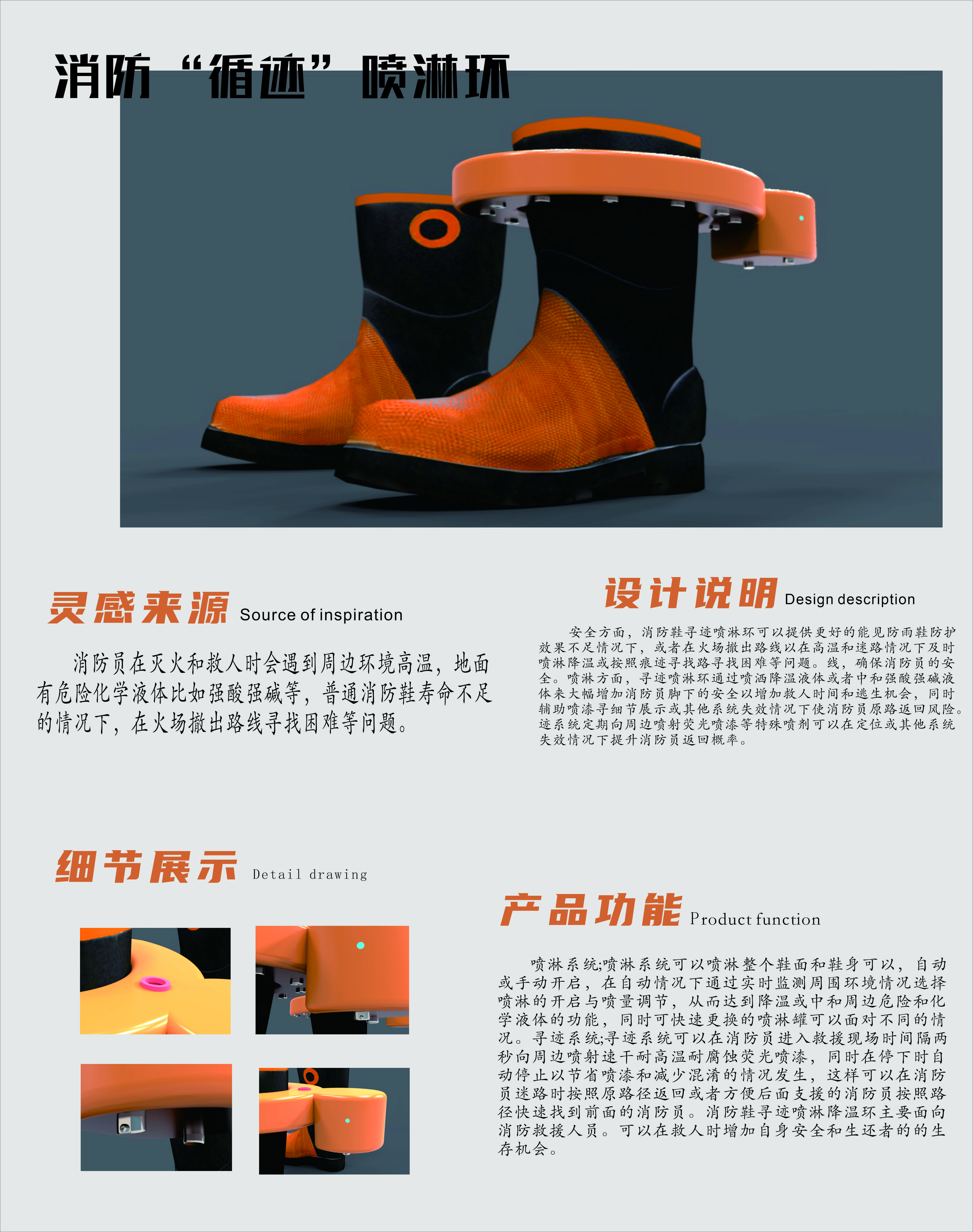 消防员在灭火和救人时会遇到周边环境高温,地面 有危险化学液体比如强酸强碱等,普通消防鞋寿命不足 的情况下,在火场撤出路线寻找困难等问题。