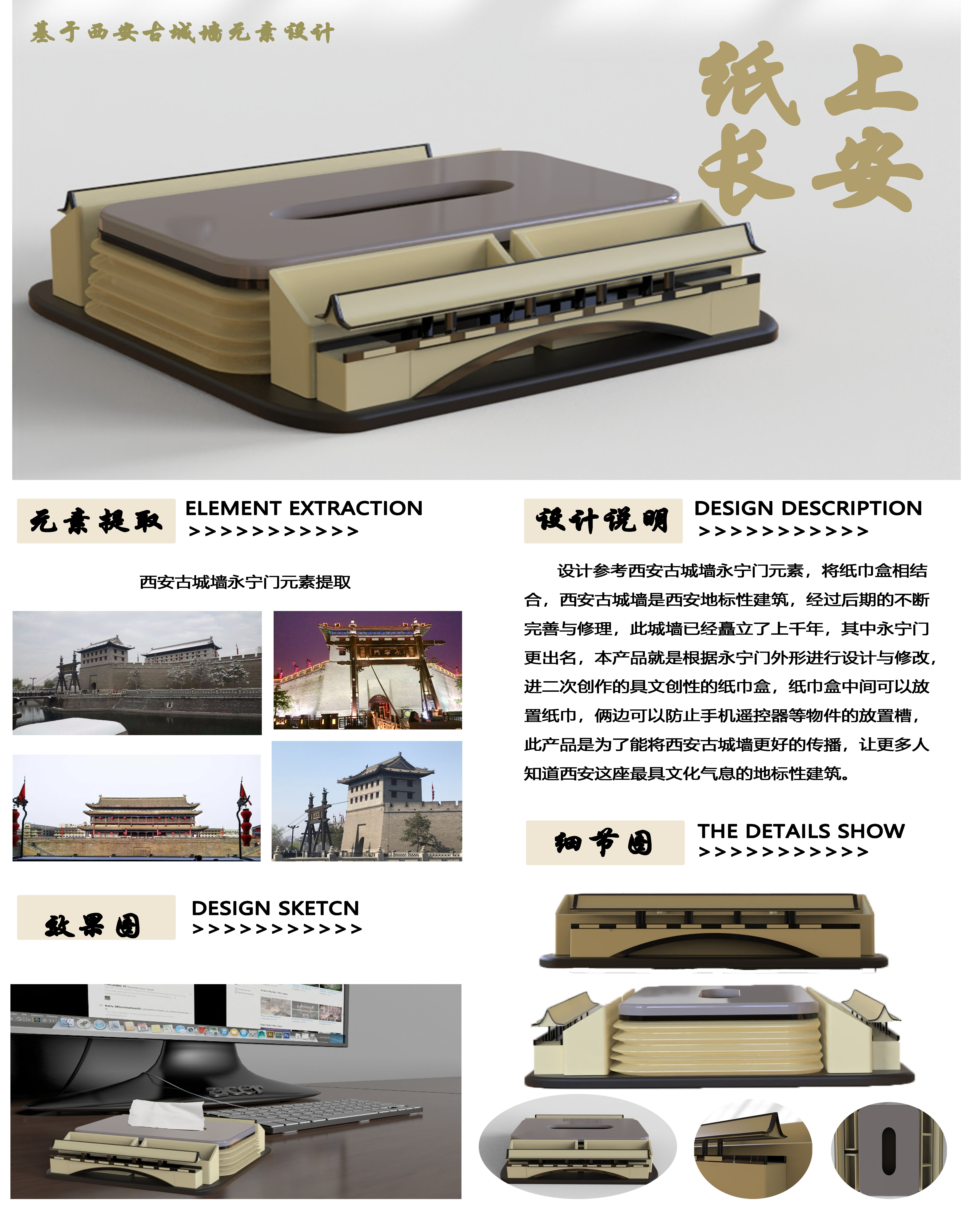 设计参考西安古城墙永宁门元素,将纸巾盒相结合,西安古城墙是西安地标性建筑,经过后期的不断完善与修理,此城墙已经矗立了上千年,其中永宁门更出名,本产品就是根据永宁门外形进行设计与修改进二次创作的具文创性的纸巾盒,纸巾盒中间可以放置纸巾,俩边可以防止手机遥控器等物件的放置槽此产品是为了能将西安古城墙更好的传播,让更多人知道西安这座最具文化气息的地标性建筑