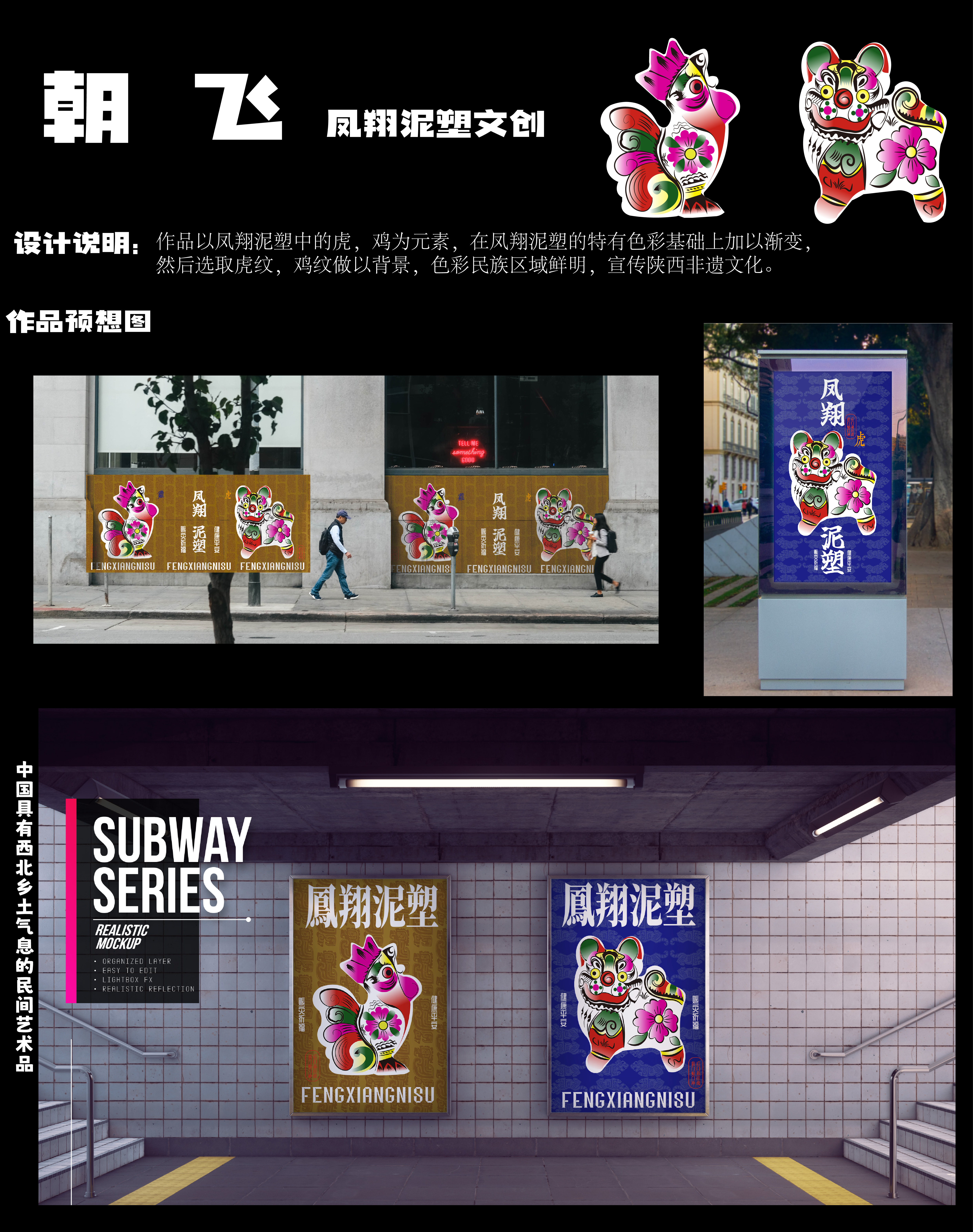 作品以凤翔泥塑中的虎,鸡为元素,在凤翔泥塑的特有色彩基础上加以渐变, 然后选取虎纹,鸡纹做以背景,色彩民族区域鲜明,宣传陕西非遗文化。