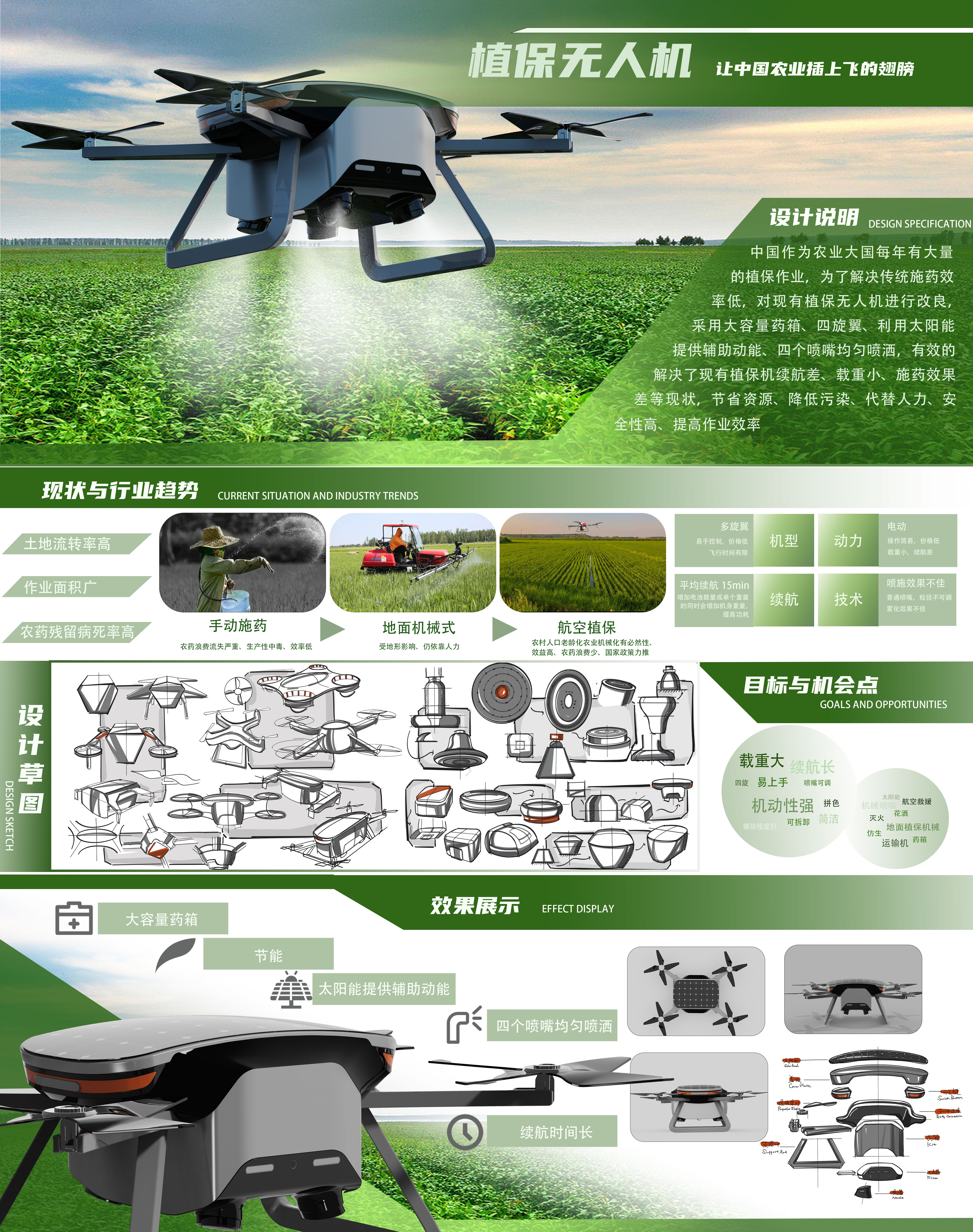 中国作为农业大国每年有大量的植保作业,为了解决传统施药效率低,对现有植保无人机进行改良采用大容量药箱、四旋翼、利用太阳能提供辅助动能、四个喷嘴均匀喷洒,有效的解决了现有植保机续航差、载重小、施药效果差等现状,节省资源、降低污染、代替人力、安全性高、提高作业效率