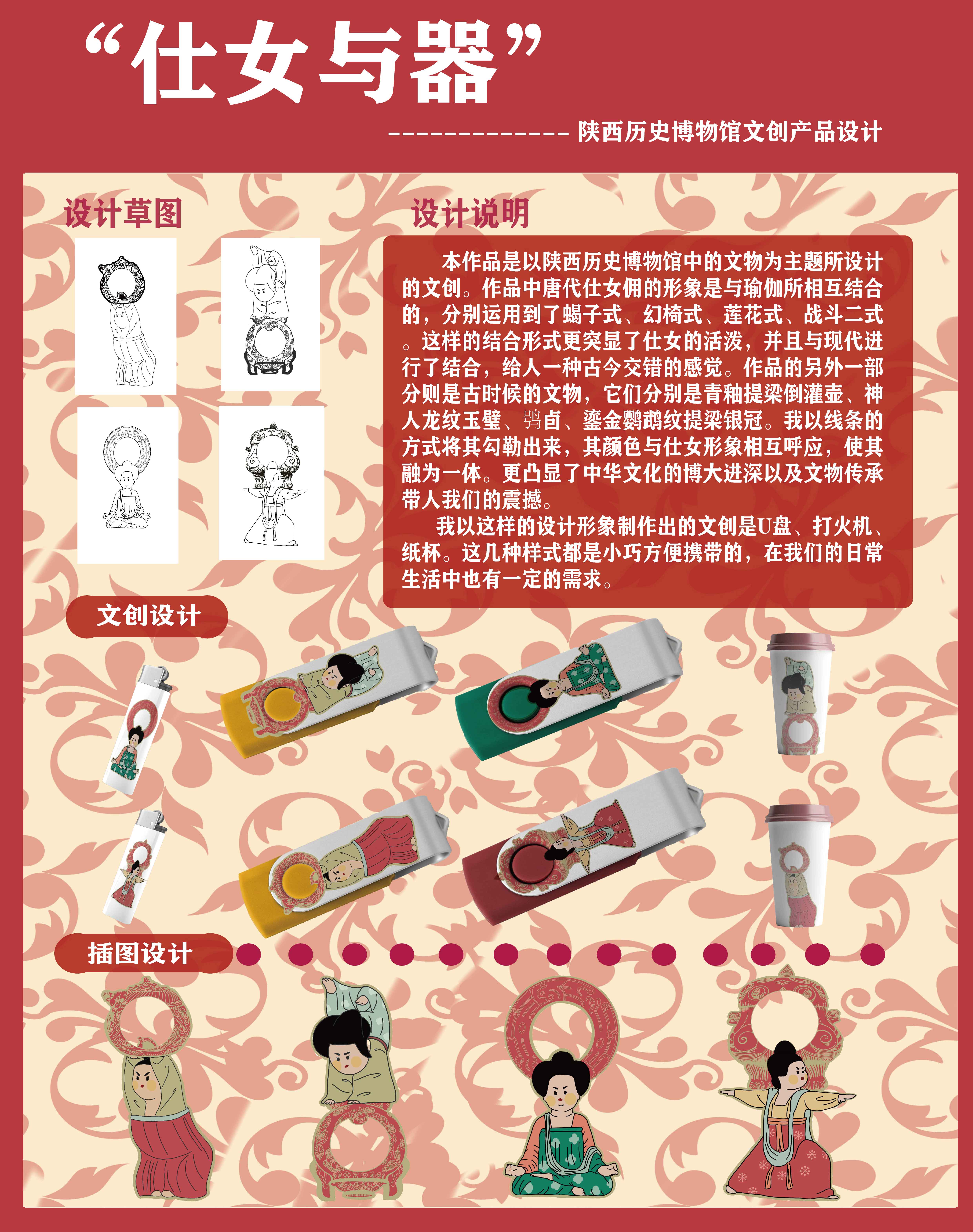 本作品是以陕西历史博物馆中的文物为主题所设计的文创作品中唐代仕女佣的形象是与瑜伽所相互结合这样的结合形式更突显了仕女的活泼并且与现代进行了结合给人一种古今交错的感觉作品的另外一部分则是古时候的文物我以线条的方式将其勾勒出来其颜色与仕女形象相互呼应使其融为一体更凸显了中华文化的博大进深以及文物传承带人我们的震撼这几种样式都是小巧方便携带的,在我们的日常生活中也有一定的需求。