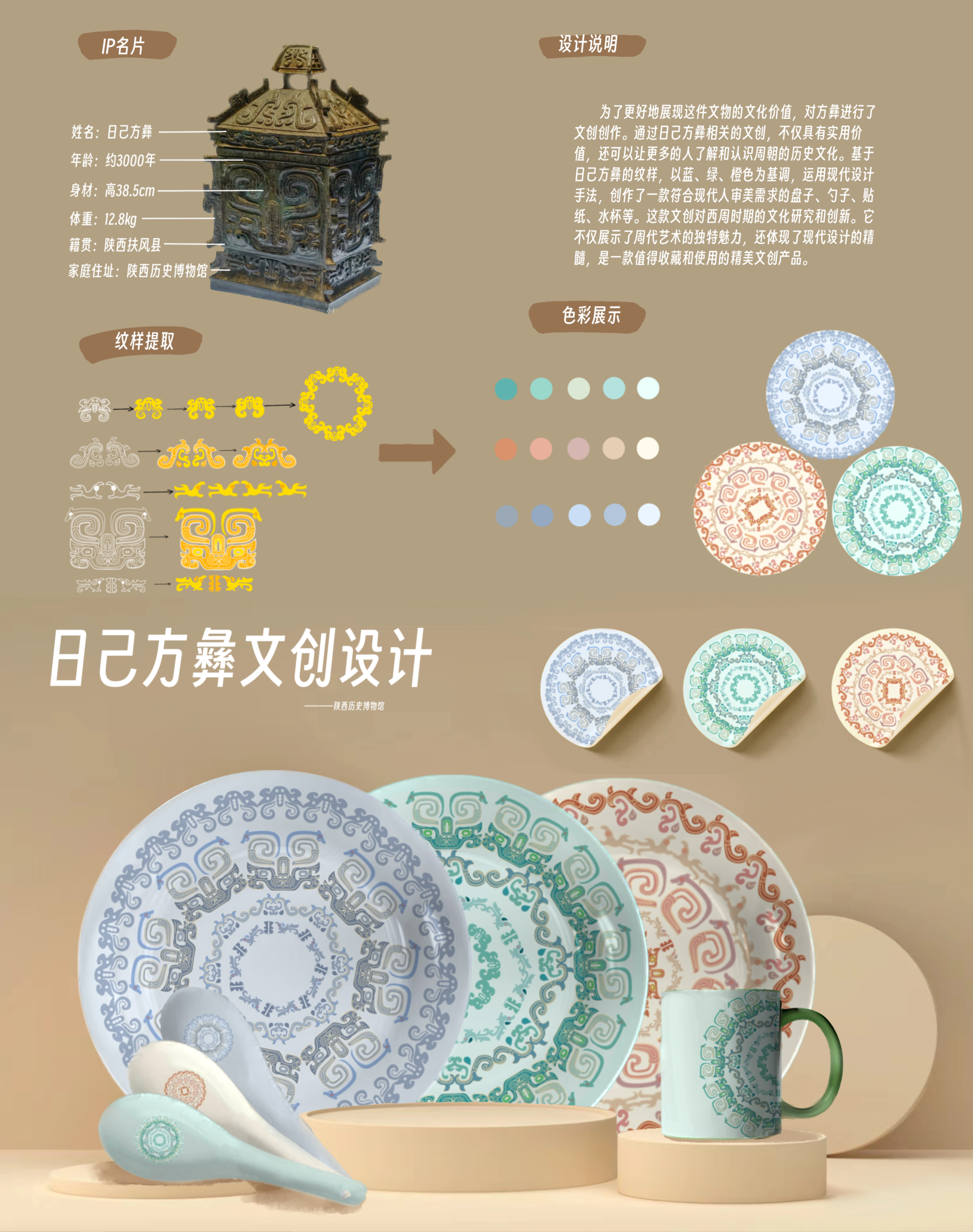 为了更好地展现这件文物的文化价值,对方彝进行了文创创作。通过日己方彝相关的文创,不仅具有实用价值,还可以让更多的人了解和认识周朝的历史文化。基于日己方彝的纹样,以蓝、绿、橙色为基调,运用现代设计手法,创作了一款符合现代人审美需求的盘子、勺子、贴纸、水杯等。这款文创对西周时期的文化研究和创新,不仅展示了周代艺术的独特魅力,还体现了现代设计的精髓,是一款值得收藏和使用的精美文创产品。