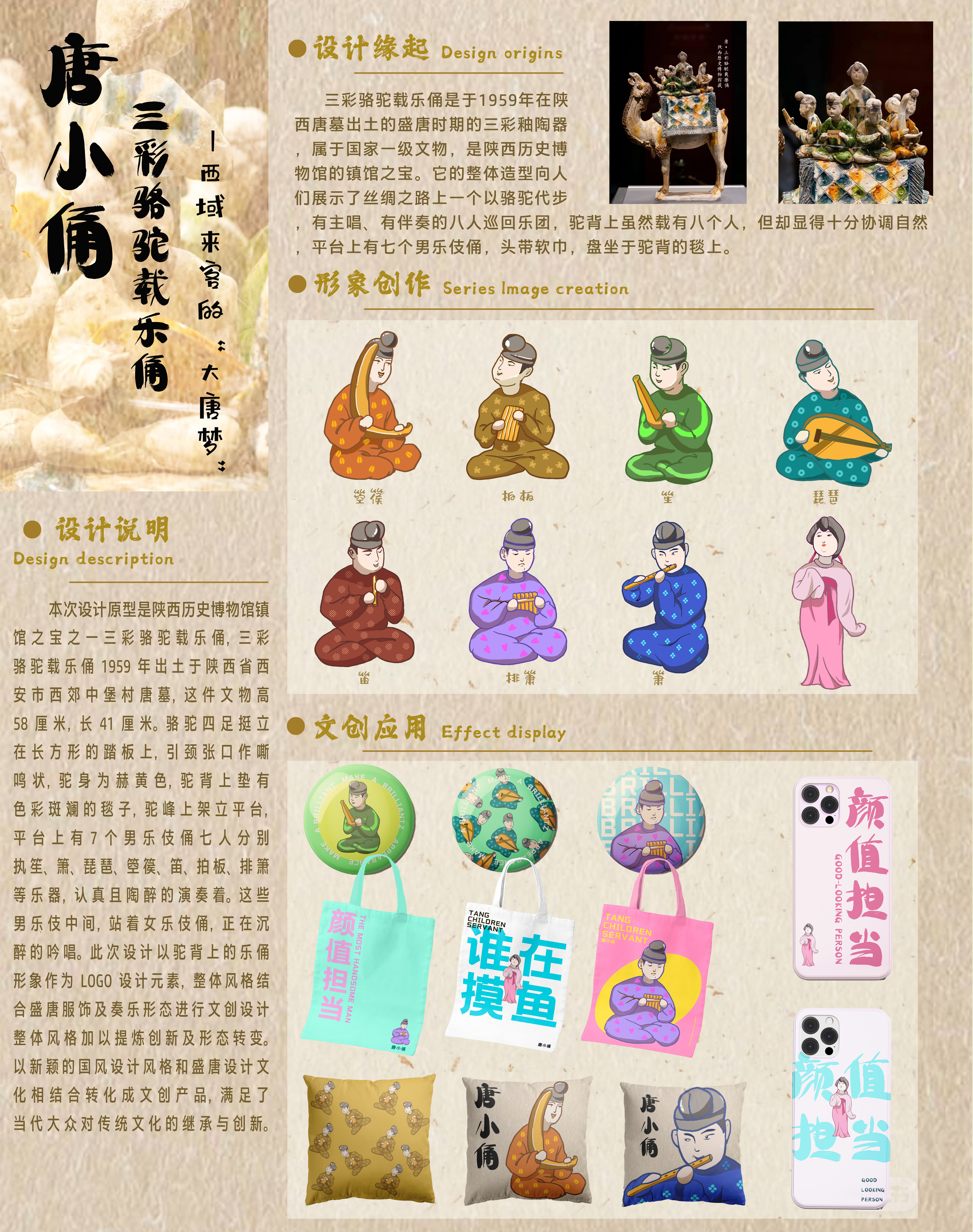 本次设计原型是陕西历史博物馆镇馆之宝之一三彩骆驼载乐俑,此次设计以驼背上的乐俑形象作为LOGO设计元素,整体风格结合盛唐服饰及奏乐形态进行文创设计,整体风格都加以提炼创新及形态转变,以新颖的国风设计风格将盛唐设计文化相结合转化成文创产品,满足了当代大众对传统文化的继承与创新。
