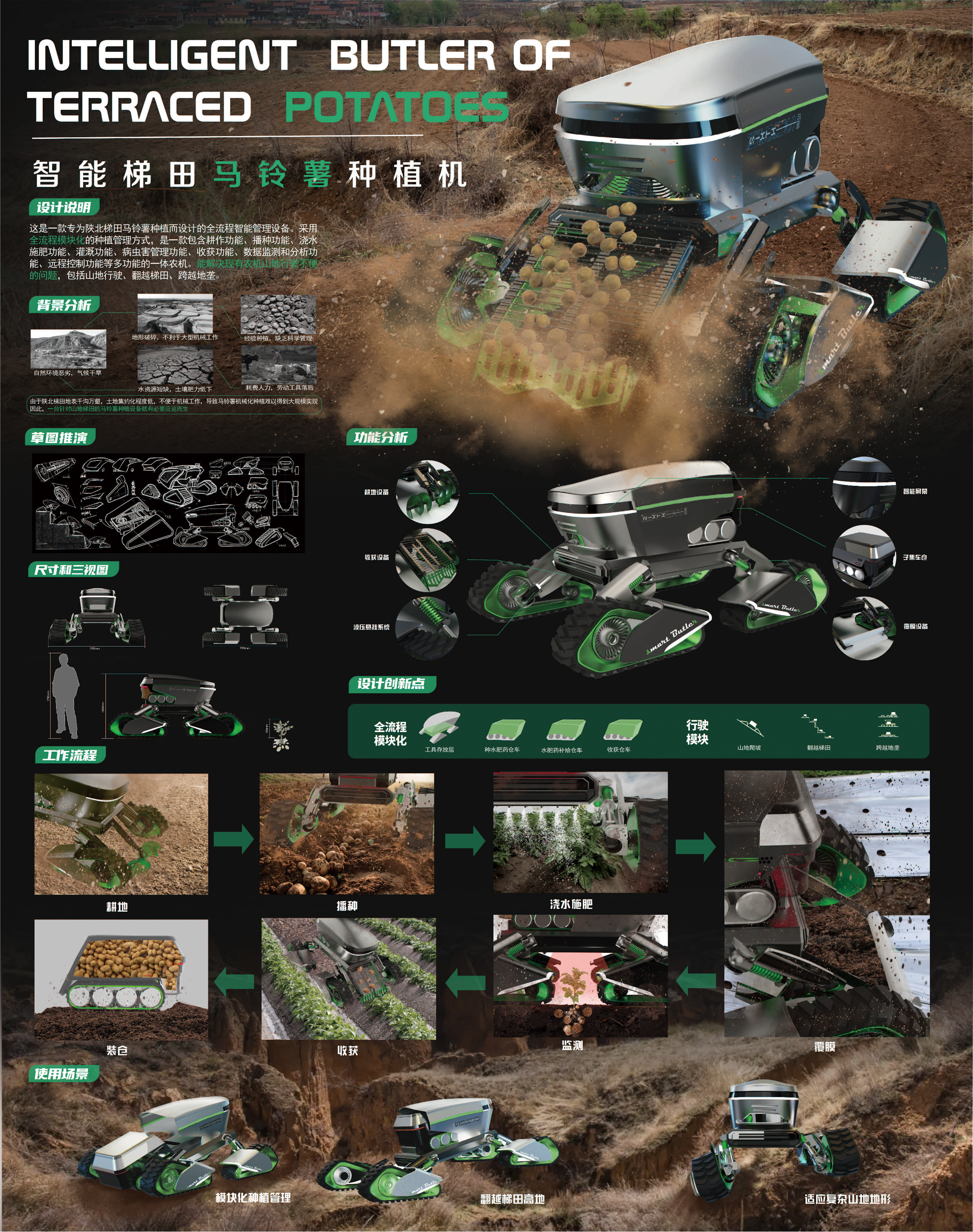 这是一款专为陕北梯田马铃薯种植而设计的全流程智能管理设备、采用全流程模块化的种植管理方式,是一款包含耕作功能、播种功能、浇水施肥功能、灌溉功能、病虫害管理功能、收获功能、数据监测和分析功能、远程控制功能等多功能的一体农机。能解决现有农机山地行驶不便的问题,包括山地行驶、翻越梯田、跨越地垄。