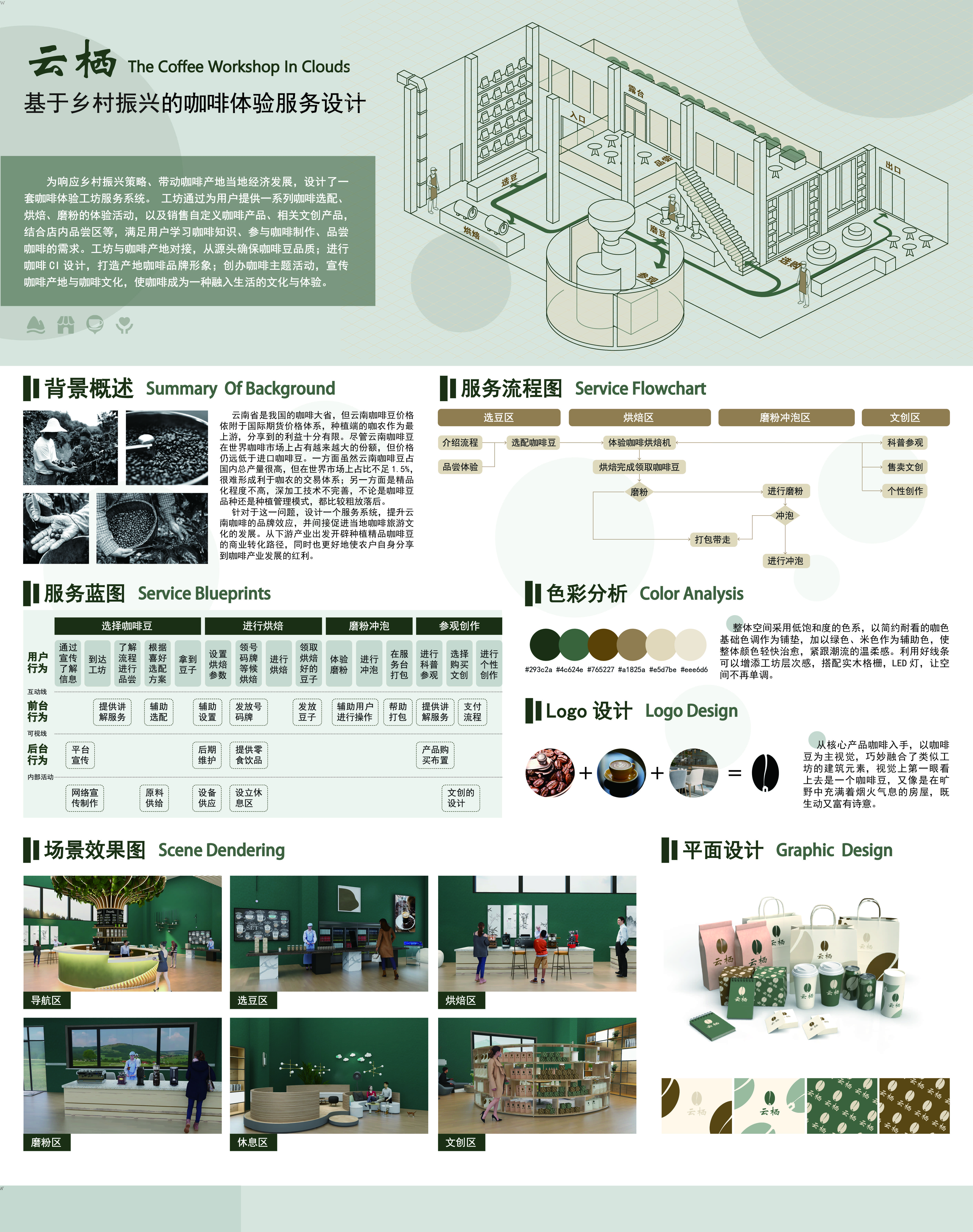 为响应乡村振兴策略、带动咖啡产地当地经济发展,设计了一套咖啡体验工坊服务系统。 工坊通过为用户提供一系列咖啡选配、烘焙、磨粉的体验活动,以及销售自定义咖啡产品、相关文创产品,结合店内品尝区等,满足用户学习咖啡知识、参与咖啡制作、品尝咖啡的需求。工坊与咖啡产地对接,从源头确保咖啡豆品质;进行咖啡CI设计,打造产地咖啡品牌形象;创办咖啡主题活动,宣传咖啡产地与文化,使咖啡成为一种融入生活的文化体验。