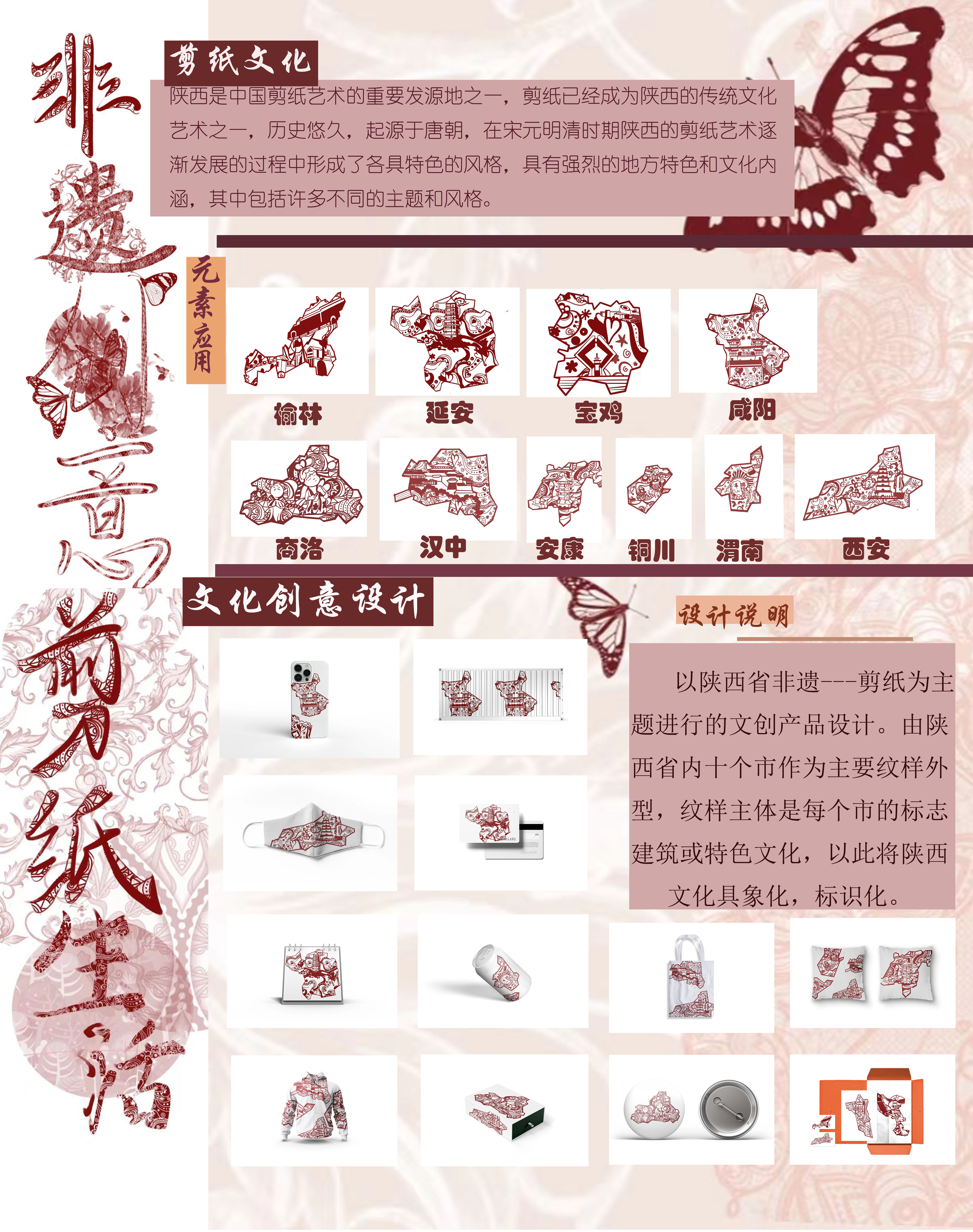 以陕西省非遗---剪纸为主题进行的文创产品设计。由陕西省内十个市作为主要纹样外型,纹样主体是每个市的标志建筑或特色文化,以此将陕西文化具象化,标识化。以各类产品为载体将陕西文化传播,高频触出现达到文化潜移默化。