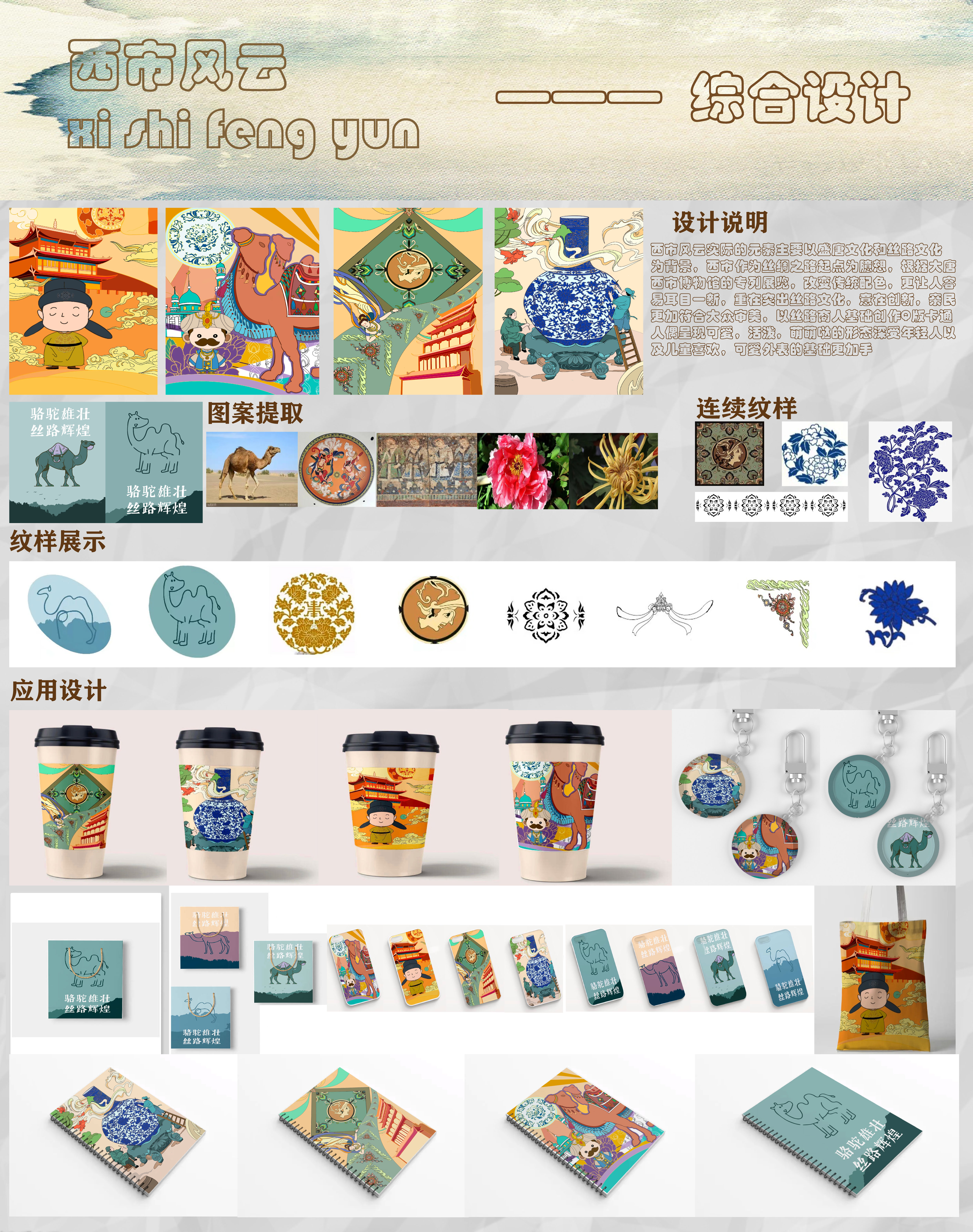西市风云设计的元素主要以盛唐文化和丝路文化为背景,西市作为丝路起点为臆想,根据大唐西市博物馆的专列展览,改变传统配色,更容易让人耳目一新,重在突出丝路文化,意在创新,亲民,更加符合大众审美,以思路商人为基础创作q版卡通人偶呈现可爱,活泼,萌萌哒的形态深受年轻人以及儿童喜欢,在可爱外表的基础更加受众于年轻人的市场,同时发扬丝路文化与大唐文化。