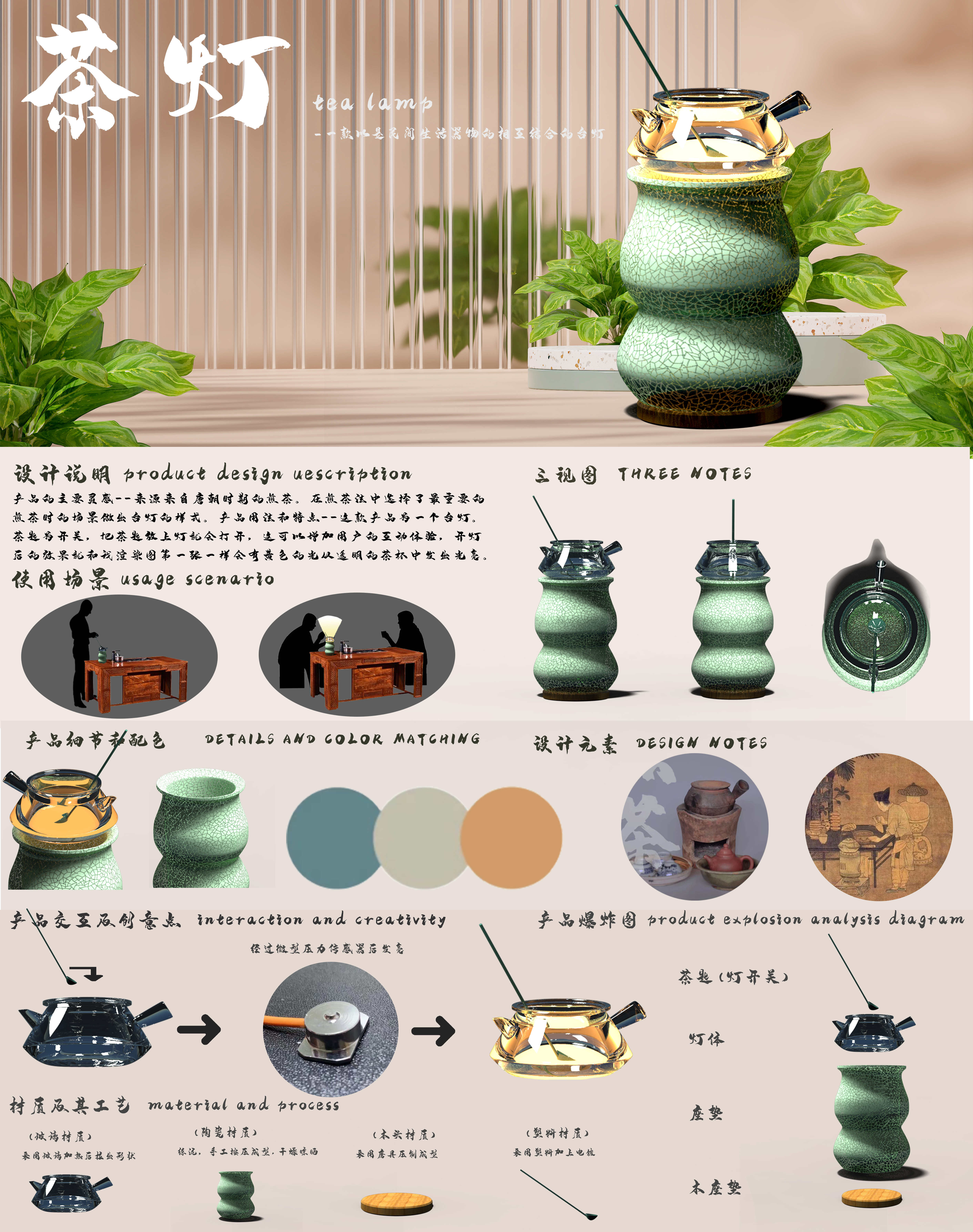 产品的主要来源来自唐朝时期的煎茶。在煎茶法中选择了最重要的煎茶时的场景做出台灯的样式。茶匙为开关,把茶匙放上灯就会打开,这可以增加用户的互动体验,开灯后的效果就会有黄色的光从透明的茶杯中发出光亮。