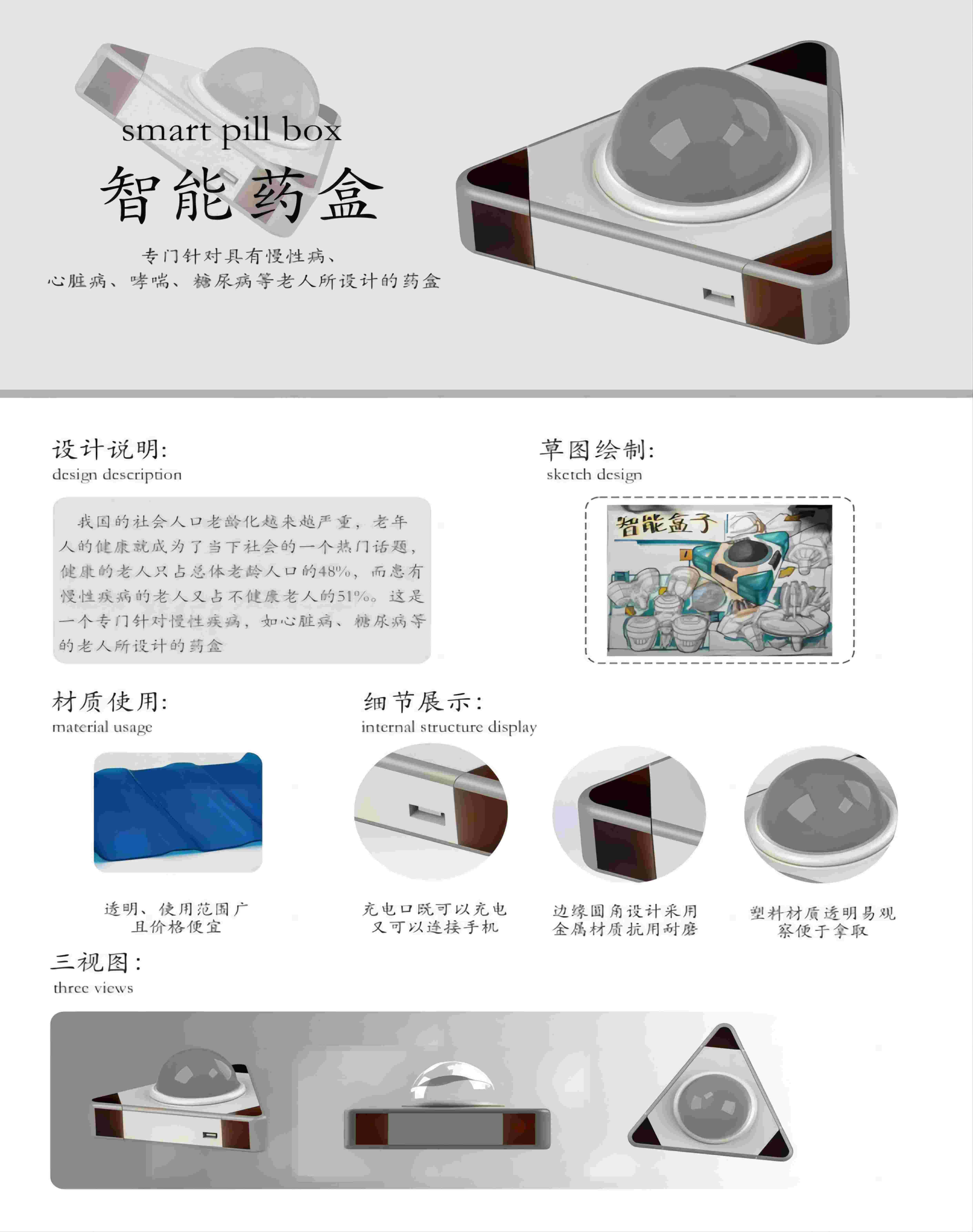 我国的社会人口老龄化越来越严重,人的健康成为了当下社会的一个热门话题,健康的老人只占总体老龄人口的48%,而患有慢性疾病的老人又占不健康老人的51%。这是一个专门针对慢性疾病,如心脏病、糖尿病等的老人所设计的药盒。