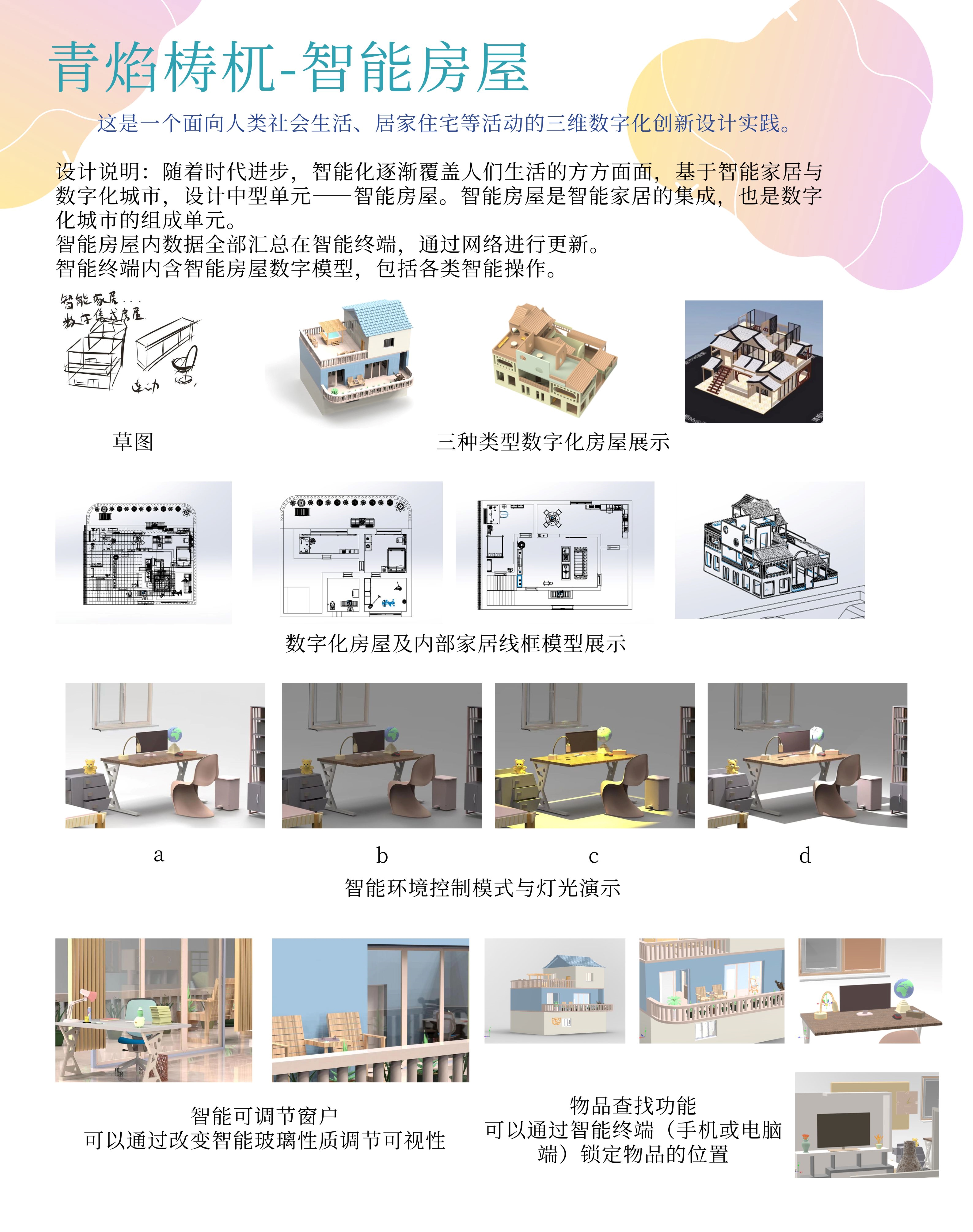 这是一个面向人类社会生活、居家住宅等活动的三维数字化创新设计实践。 随着时代进步,智能化逐渐覆盖人们生活的方方面面,基于智能家居与数字化城市,设计中型单元——智能房屋。智能房屋是智能家居的集成,也是数字化城市的组成单元。 智能房屋内数据全部汇总在智能终端,通过网络进行更新。 智能终端内含智能房屋数字模型,包括各类智能操作。