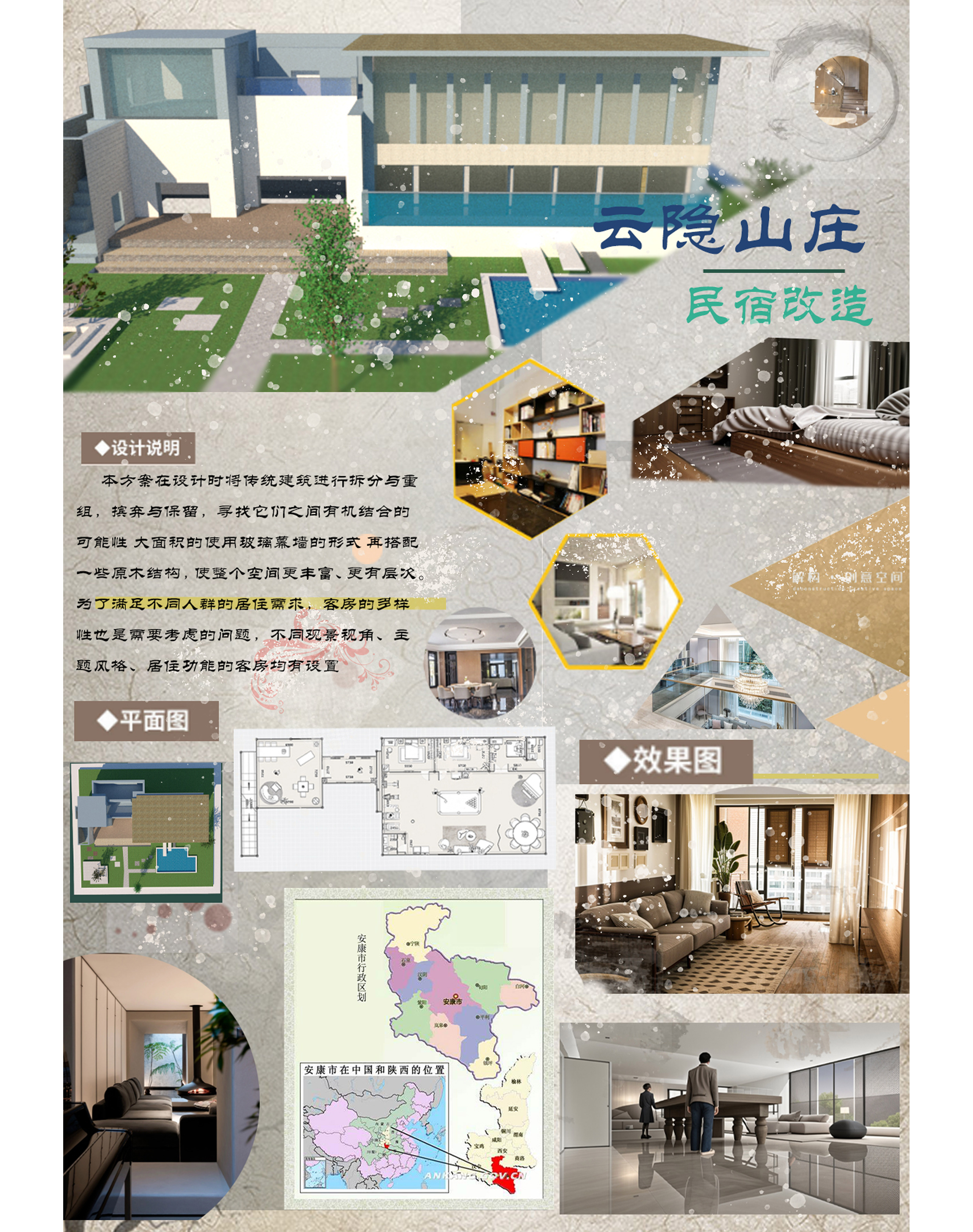 本方案在设计时将传统建筑进行拆分与重组,摈弃与保留,寻找它们之间有机结合的可能性 大面积的使用玻璃幕墙的形式 再搭配一些原木结构,使整个空间更丰富、更有层次。为了满足不同人群的居住需求,客房的多样性也是需要考虑的问题,不同观景视角、主题风格、居住功能的客房均有设置