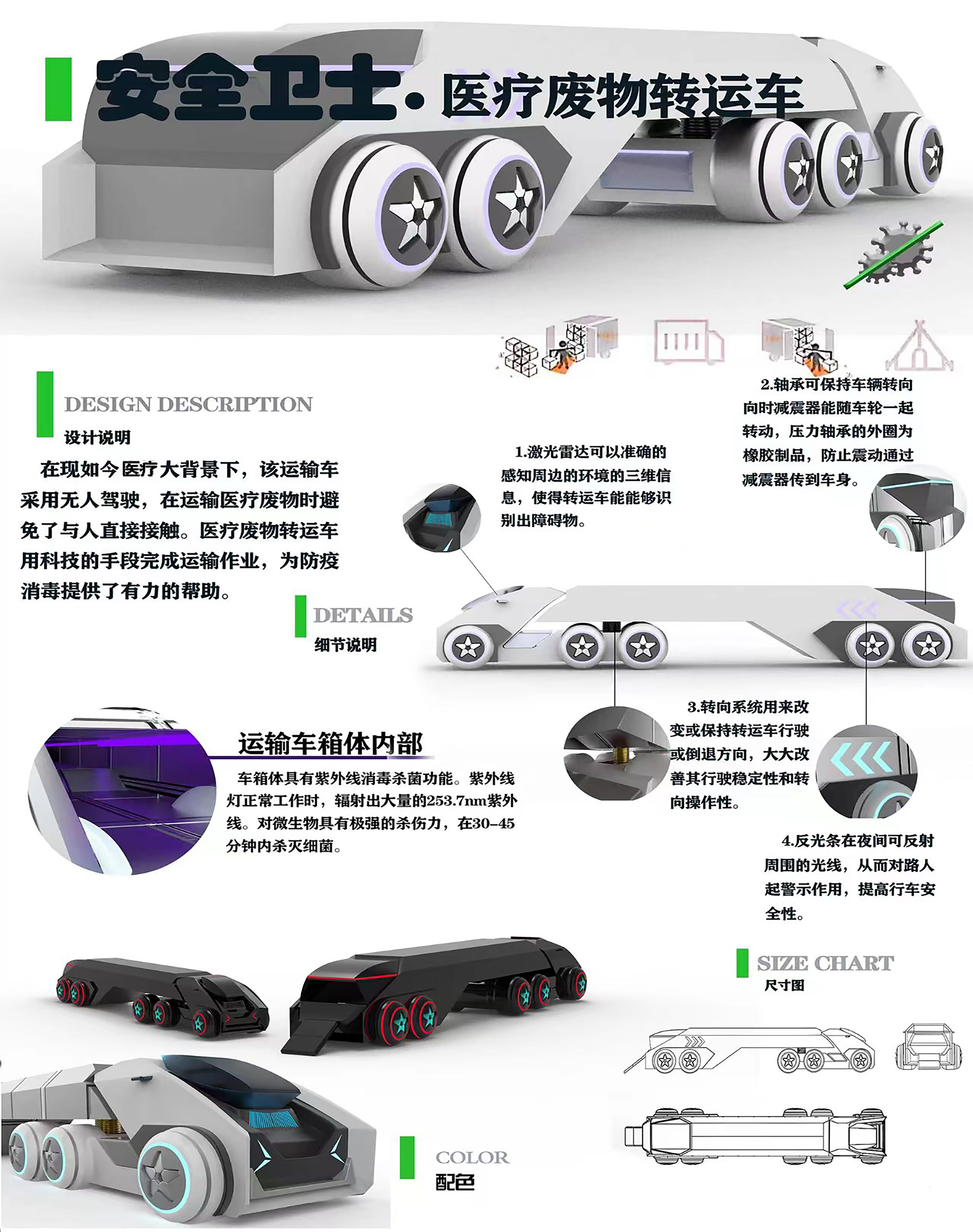 该运输车采用无人驾驶,在运输医疗废物时避免了与人直接接触。内部有紫外线杀菌消毒功能,有极强的杀伤力。车体的反转系统用来改变或保持转运车行驶或倒退方向,大大改善了其稳定性和转向操作性,其反光条在夜间也可以反射周围的光线。车头的激光雷达可以准确感知周边环境的三维信息,使转运车可以识别出障碍物。轴承可保持车辆转向时减震器能随车轮一起转动,压力轴承的外围为橡胶制品,防止震动通过减震器传到车身。