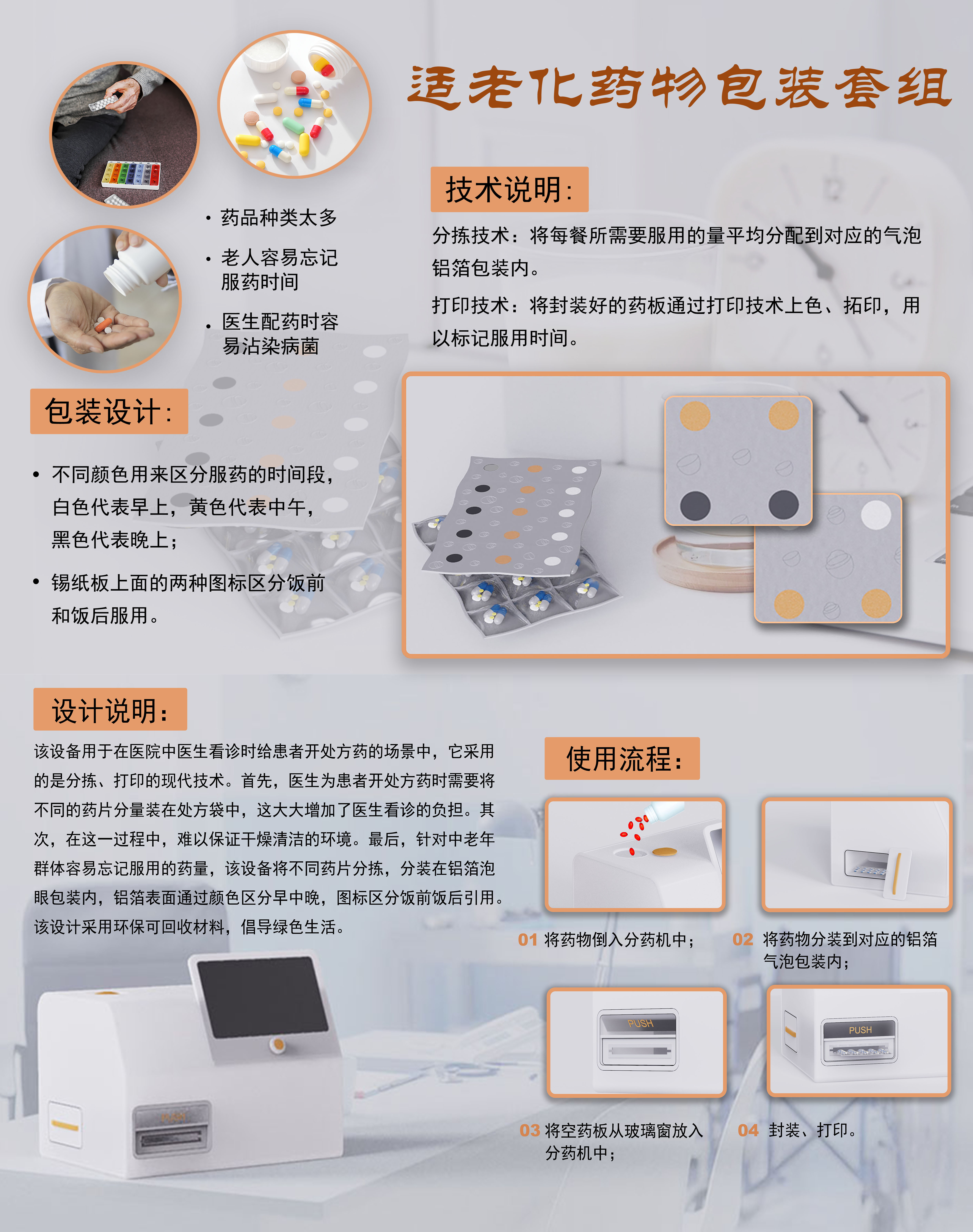 该设备用于在医院中医生看诊时给患者开处方药的场景中,它采用的是分拣、打印的现代技术。首先,医生为患者开处方药时需要将不同的药片分量装在处方袋中,这大大增加了医生看诊的负担。其次,在这一过程中,难以保证干燥清洁的环境。最后,针对中老年群体容易忘记服用的药量,该设备将不同药片分拣,分装在铝箔泡眼包装内,铝箔表面通过颜色区分早中晚,图标区分饭前饭后饮用。该设计采用环保可回收材料,倡导绿色生活!