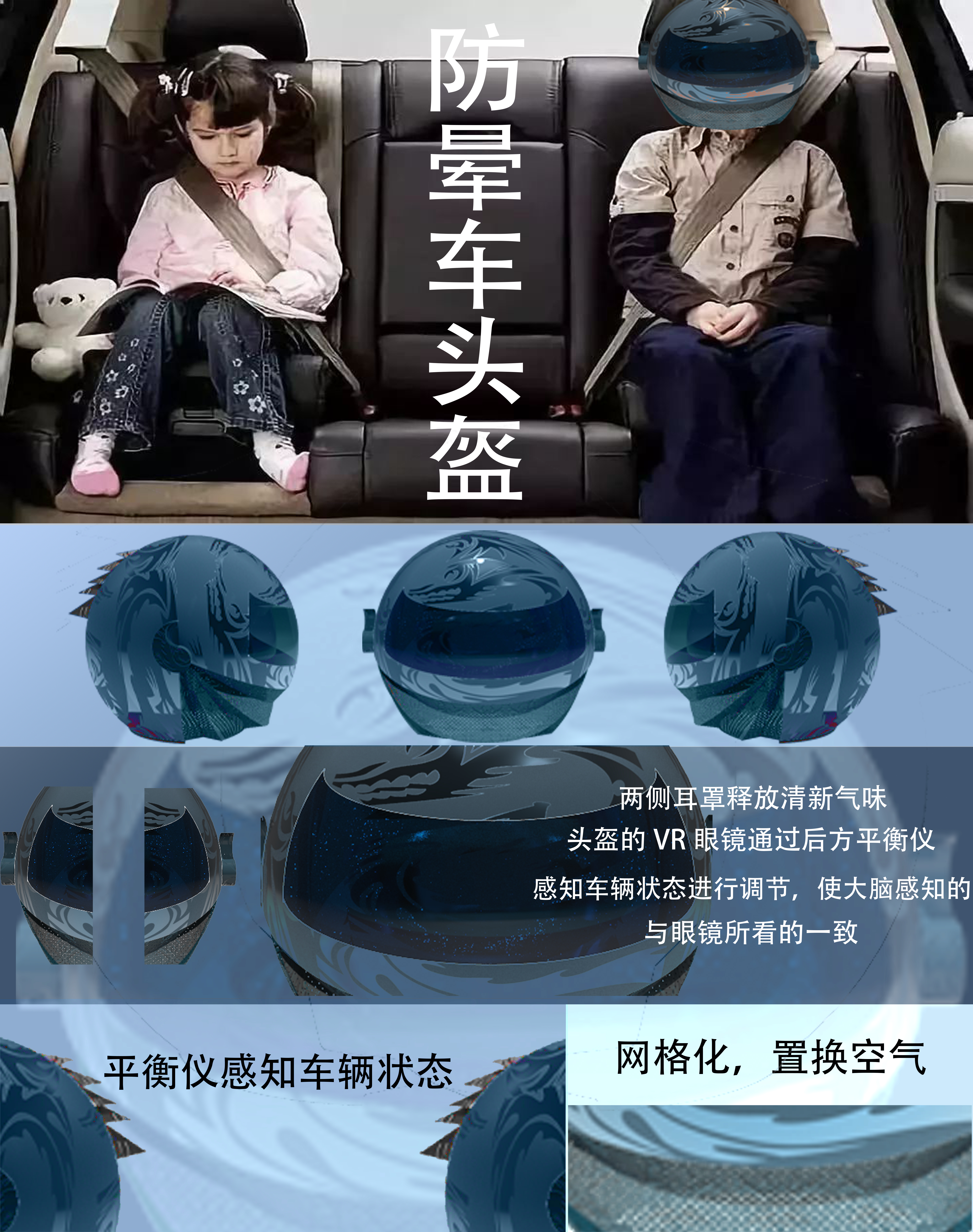 头盔的VR眼镜通过后方平衡仪感知车辆状态进行调节,使大脑感知的与眼镜所看的一致。两侧耳罩释放清新气味,网格化,置换空气,用来达到防止晕车常见的两种问题,一是气味,二是平衡。