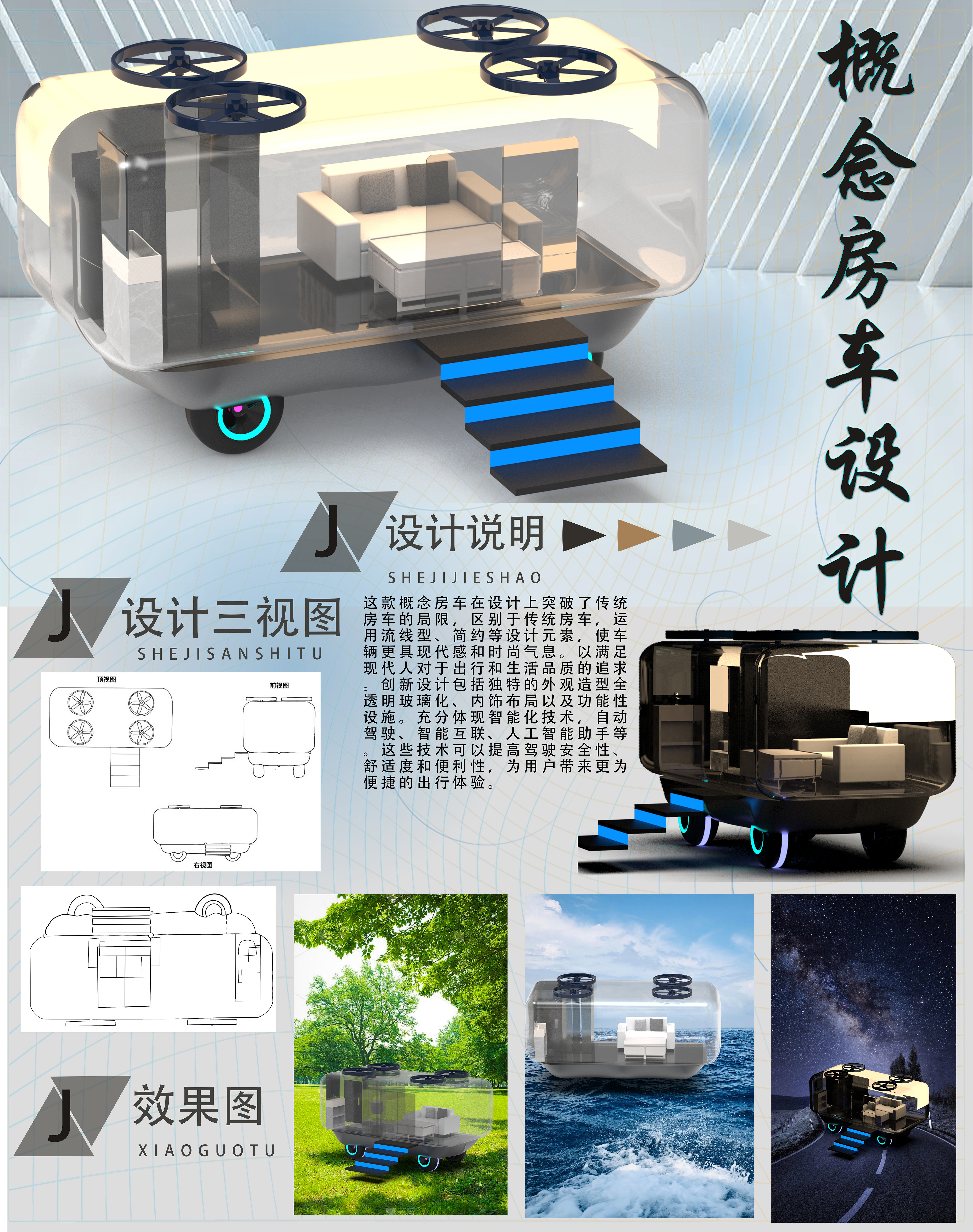 这款概念房车在设计上突破了传统房车的局限,区别于传统房车,运用流线型、简约等设计元素,使车辆更具现代感和时尚气息。以满足现代人对于出行和生活品质的追求。创新设计包括独特的外观造型全透明玻璃化、内饰布局以及功能性设施。充分体现智能化技术,自动驾驶、智能互联、人工智能助手等。这些技术可以提高驾驶安全性、舒适度和便利性,为用户带来更为便捷的出行体验。
