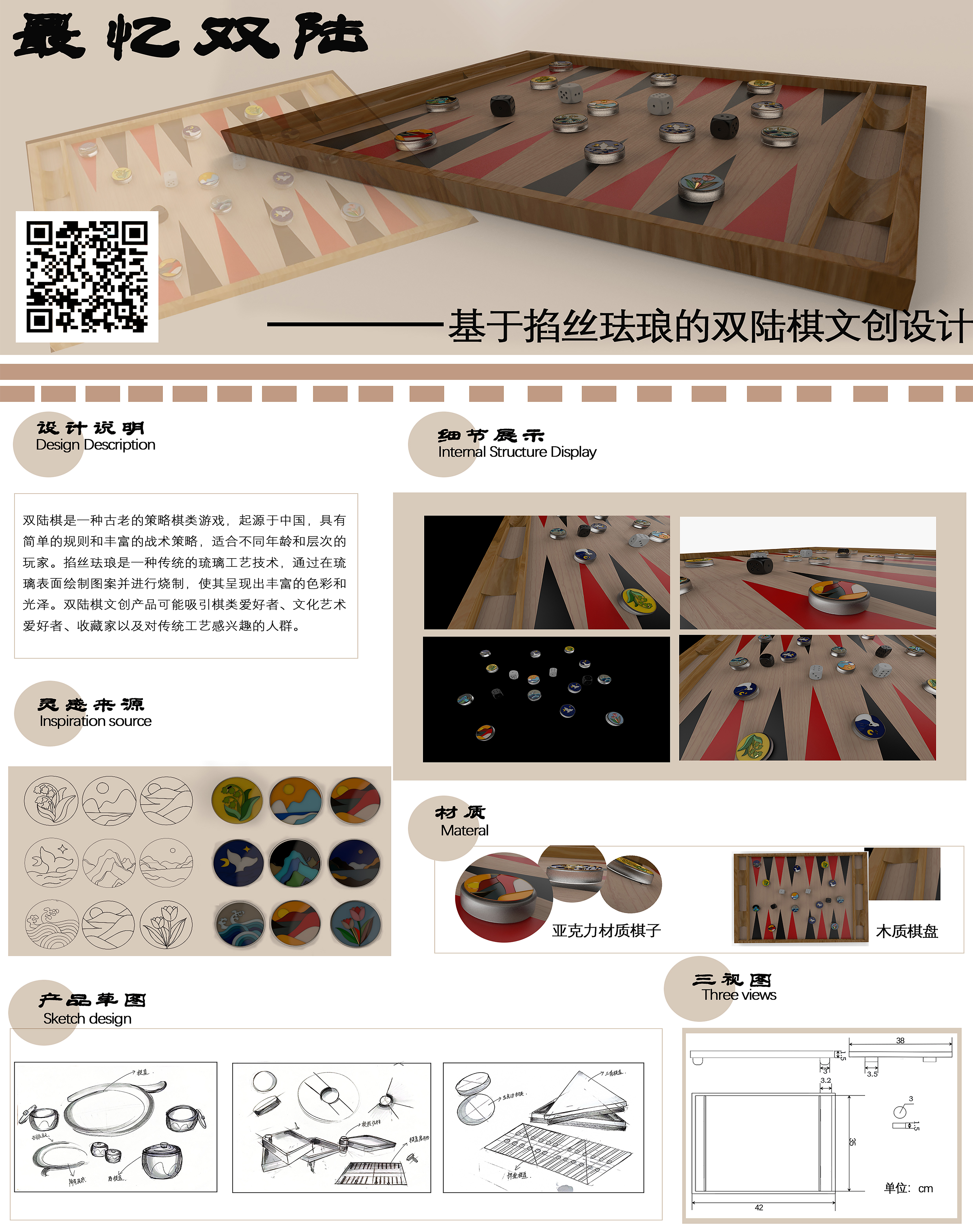 在造型上对传统棋盘进行改良设计,融入现代元素和掐丝珐琅工艺的特点提升艺术性和观赏性。在材质上为提高该产品形式和质感将掐丝珐琅工艺与现代材质相结合,棋盘和棋子使用木质材料和亚克力材质。美学上在保留双陆棋的游戏的基础上,注重产品的美学设计和使用体验,的棋子上刻上传统纹样,再进行掐丝提取纹样。未来文创产品应该多注重实用性与美观性的融合,这样才能让文化与产品相结合。传承文化一是使命,而创新表达一直是动力。