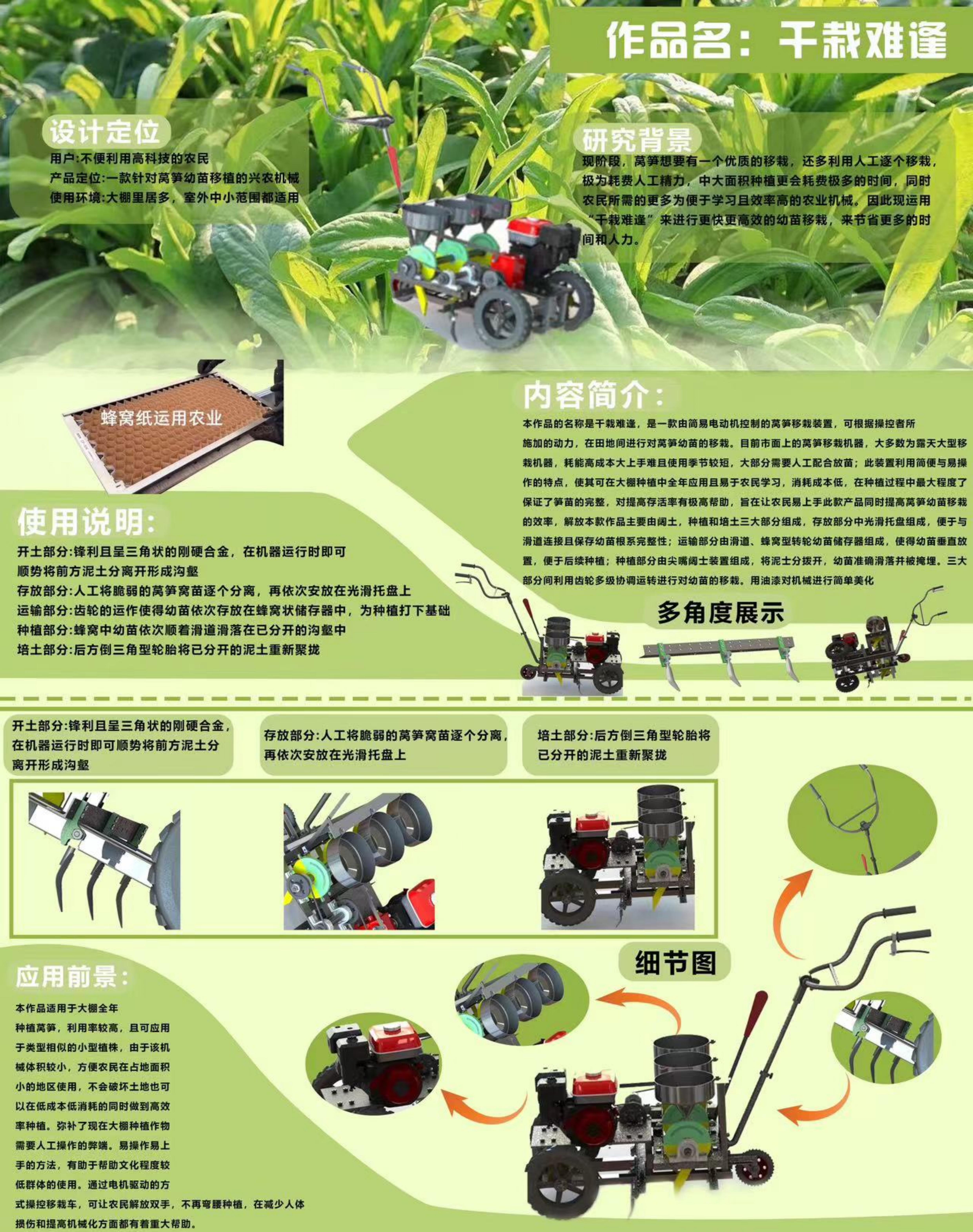 本作品名是一款由简易电动机控制的莴笋移栽装置,可根据操控者所施加的动力,在田地间进行对莴笋幼苗的移栽。主要包括存放运输和种植三部分。目前市面上的莴笋移栽机器大多数为露天大型移栽机器,耗能高成本大上手难且使用季节较短,大部分需要人工配合放苗,此装置利用简便与易操作的特点,使其可在大棚种植中全年应用且易于农民学习,消耗成本低,在种植过程中最大程度了保证了笋苗的完整,对提高存活率有极高帮助。