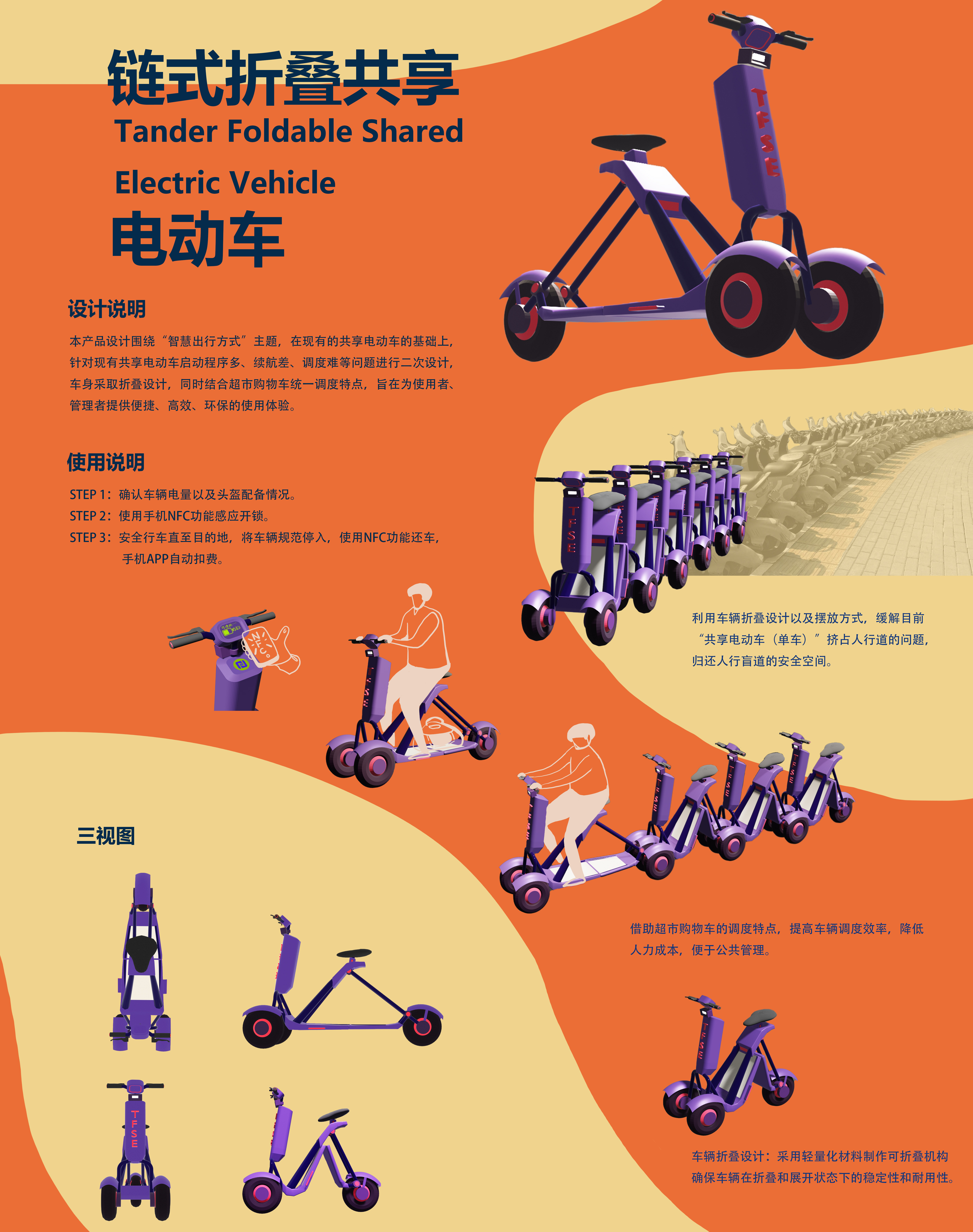 如今,共享交通发展近十年,但其所占道路空间较大、不易调度等问题难以解决,因此围绕“智慧出行方式”主题,在传统共享电动车的基础上,设计出了一款链式折叠共享电动车。
