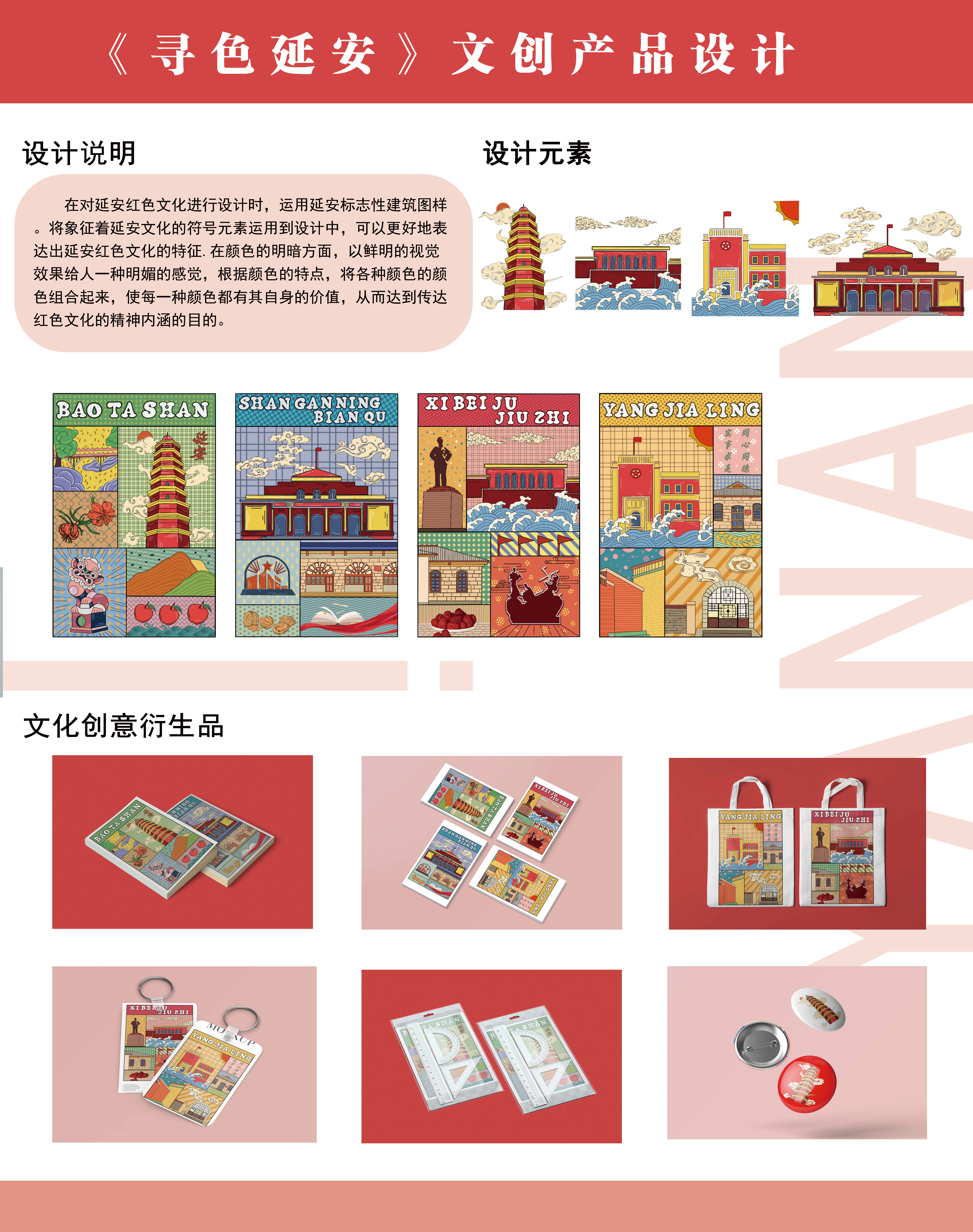 在对延安红色文化进行设计时,运用延安标志性建筑图样。将象征着延安文化的符号元素运用到设计中,可以更好地表达出延安红色文化的特征.在颜色的明暗方面,以鲜明的视觉效果给人一种明媚的感觉,根据颜色的特点,将各种颜色的颜色组合起来,使每一种颜色都有其自身的价值,从而达到传达红色文化的精神内涵的目的。