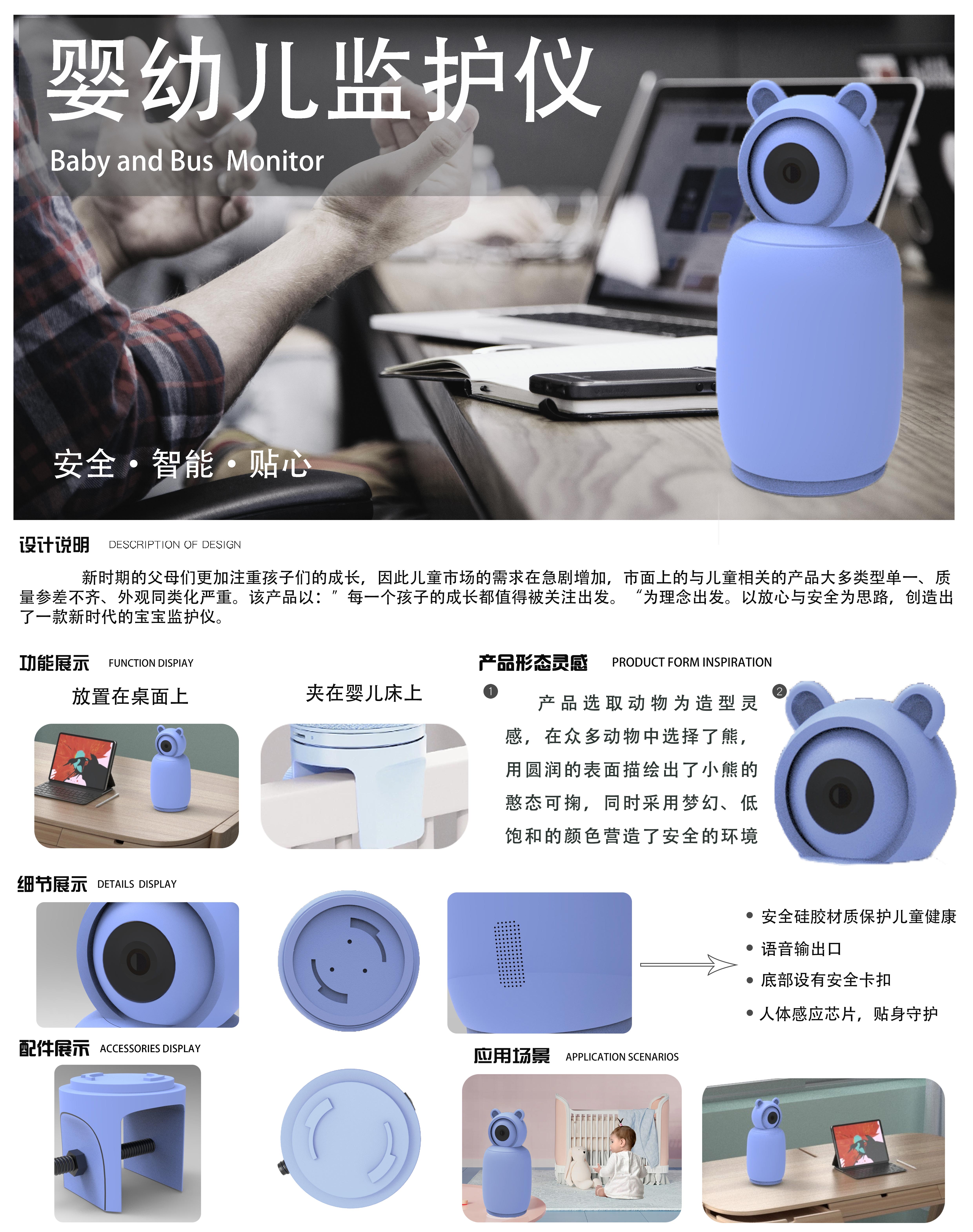 新时期的父母们更加注重孩子们的成长,因此儿童市场的需求在急剧增加,市面上的与儿童相关的产品大多类型单一、质量参差不齐、外观同类化严重。该产品以放心与安全为思路,创造出了一款新时代的宝宝监护仪。本产品选取动物为造型灵感,在众多动物中选择了熊,用圆润的表面描绘出了小熊的憨态可掬,同时采用低饱和的颜色营造了安全的氛围。表面使用了食品级硅胶包裹摄像头,避免宝宝磕碰、缓解冲击的同时,一改监控产品的冰冷触感。