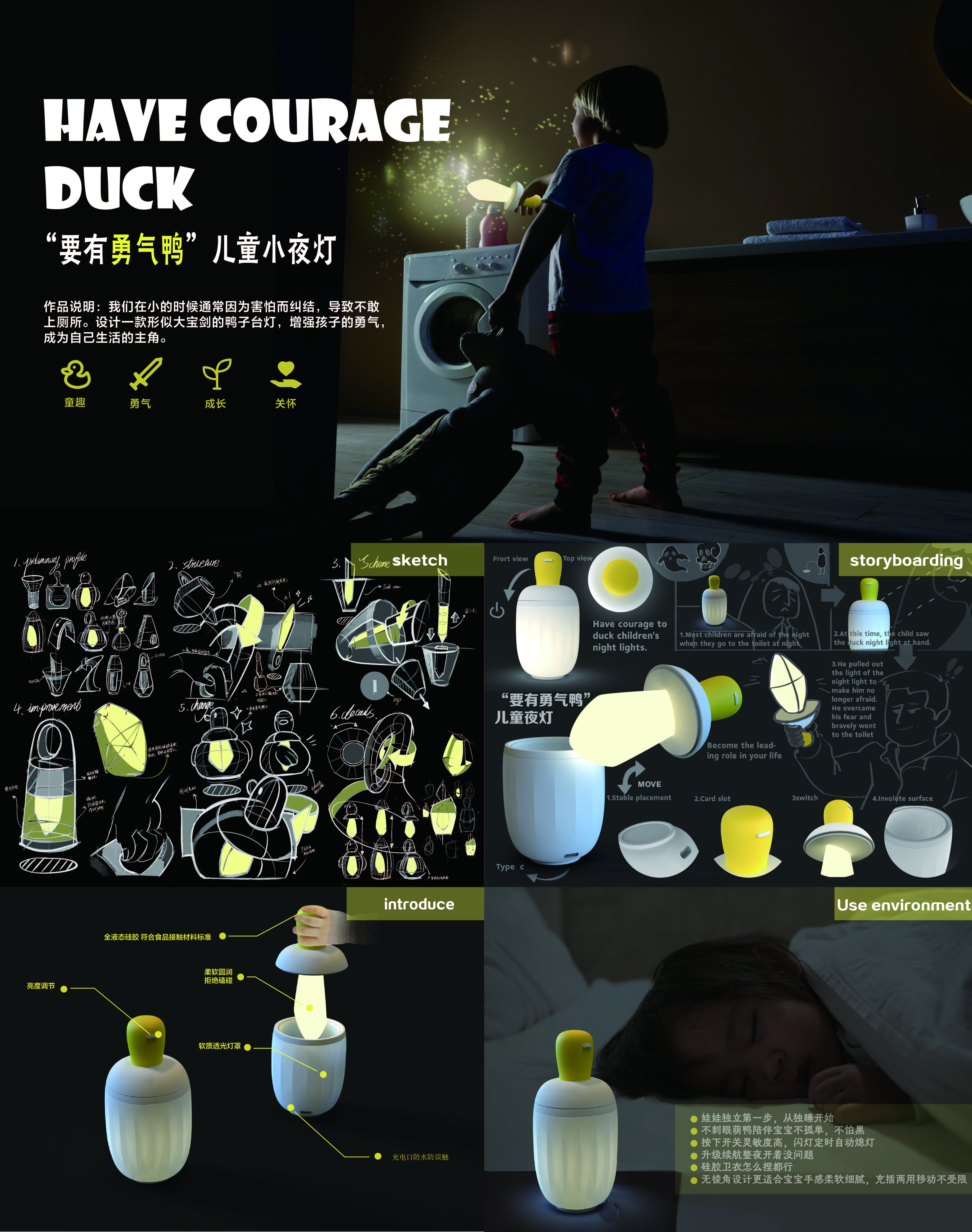 作品说明:我们在小的时候通常因为害怕黑暗而纠结,导致不敢上厕所。设计一款形似大宝剑的鸭子台灯,增强孩子的勇气,成为自己生活的主角。