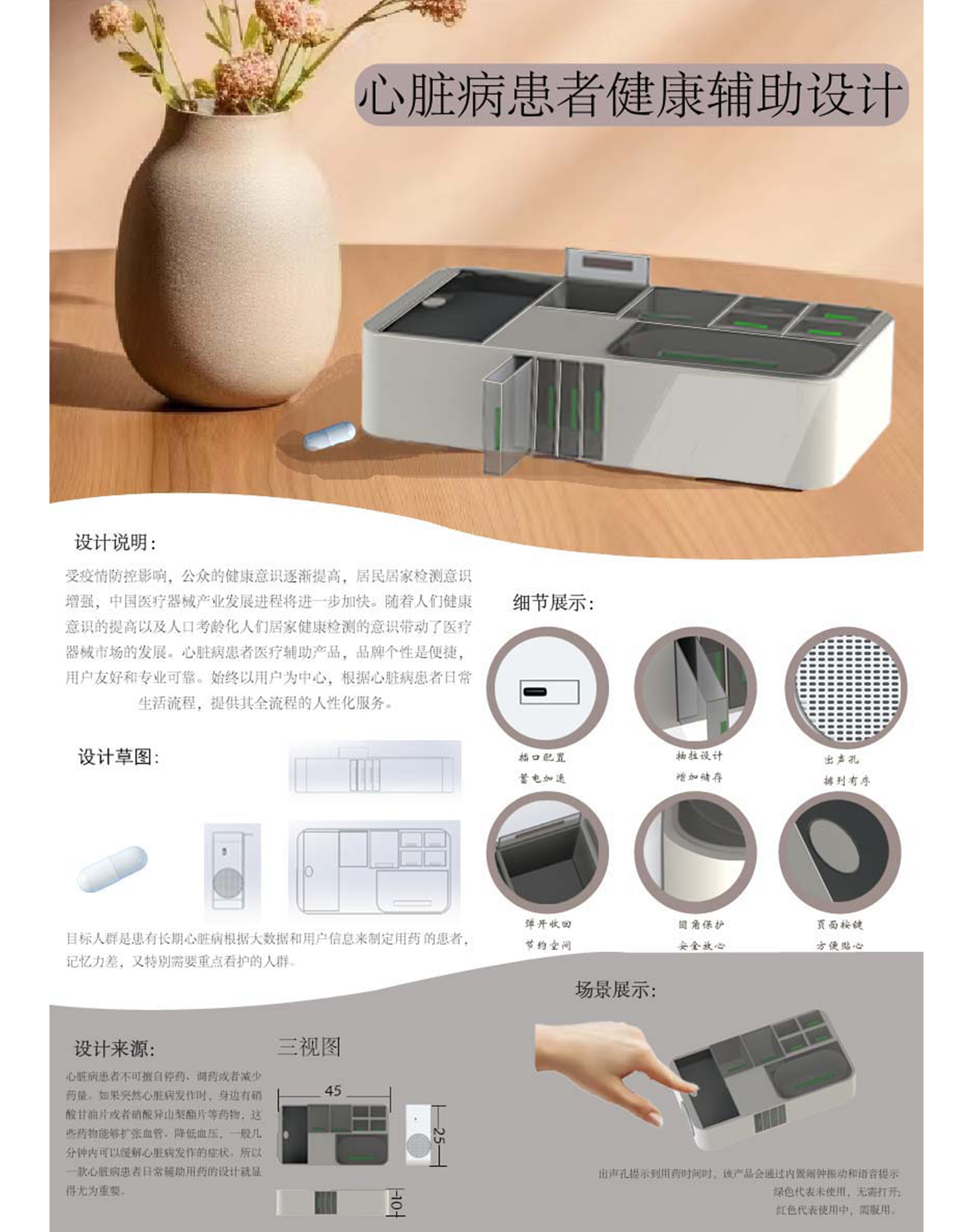 心脏病患者健康辅助产品贯穿其全流程,提供用药提醒、药物储备、数据分析、实时监测等功能,主要是通过传感器实时监测用户的心脏病相关指标,并将数据发送到处理器进行处理和分析。处理器根据分析结果,调整用户的用药推荐,从而达到辅助治疗的目的。同时,硬件产品还可以与手机、平板等设备进行通信,实现数据同步和远程监测等功能。