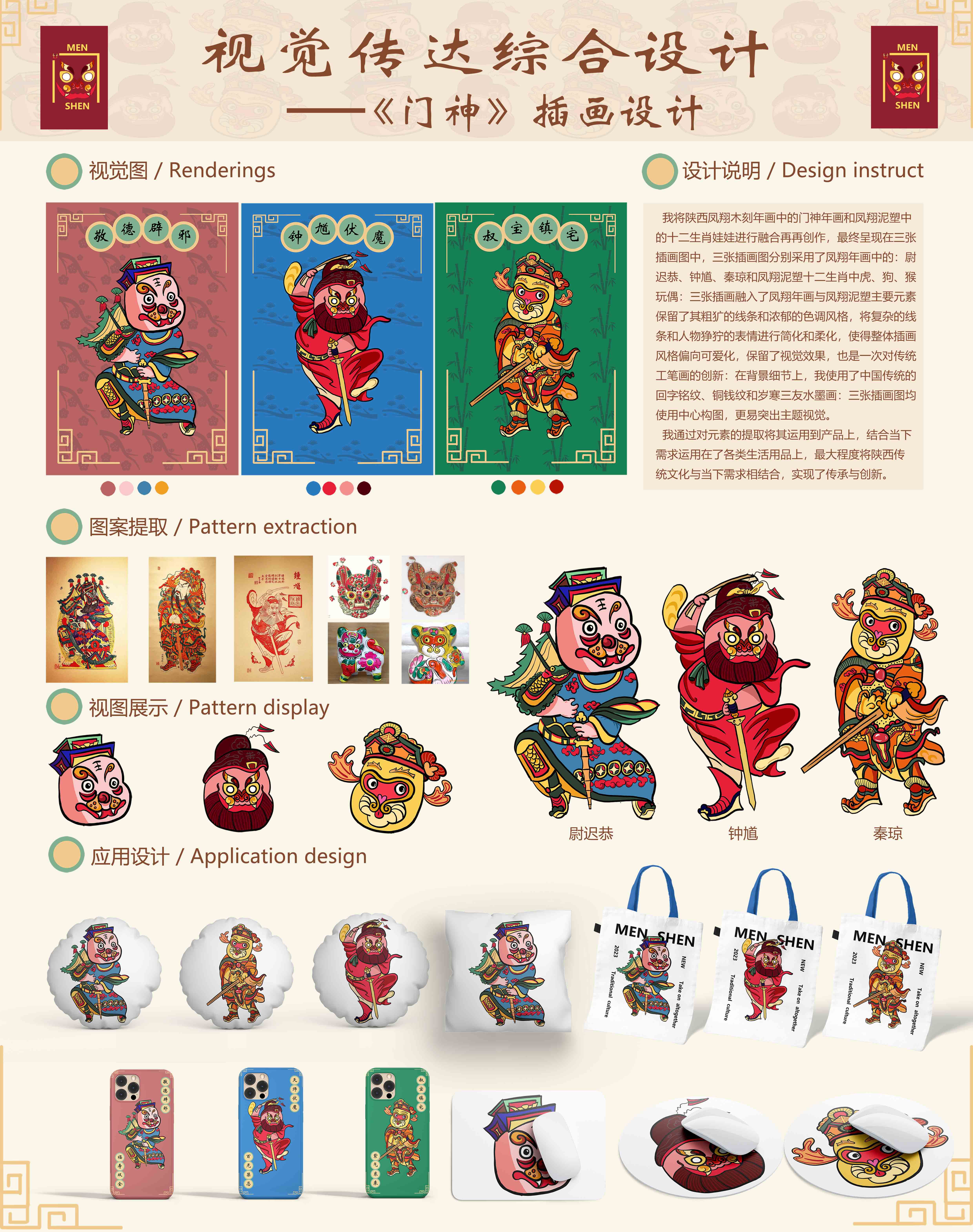 我将凤翔木刻年画中的门神像和凤翔泥塑中的十二生肖娃娃进行融合再创作,三张插画中融入了门神像中的:尉迟恭、钟馗、秦琼和十二生肖泥塑:虎、狗、猴,在保留了原作品风格的基础上进行大胆创作,并根据现实需要将元素融入日常生活中。
