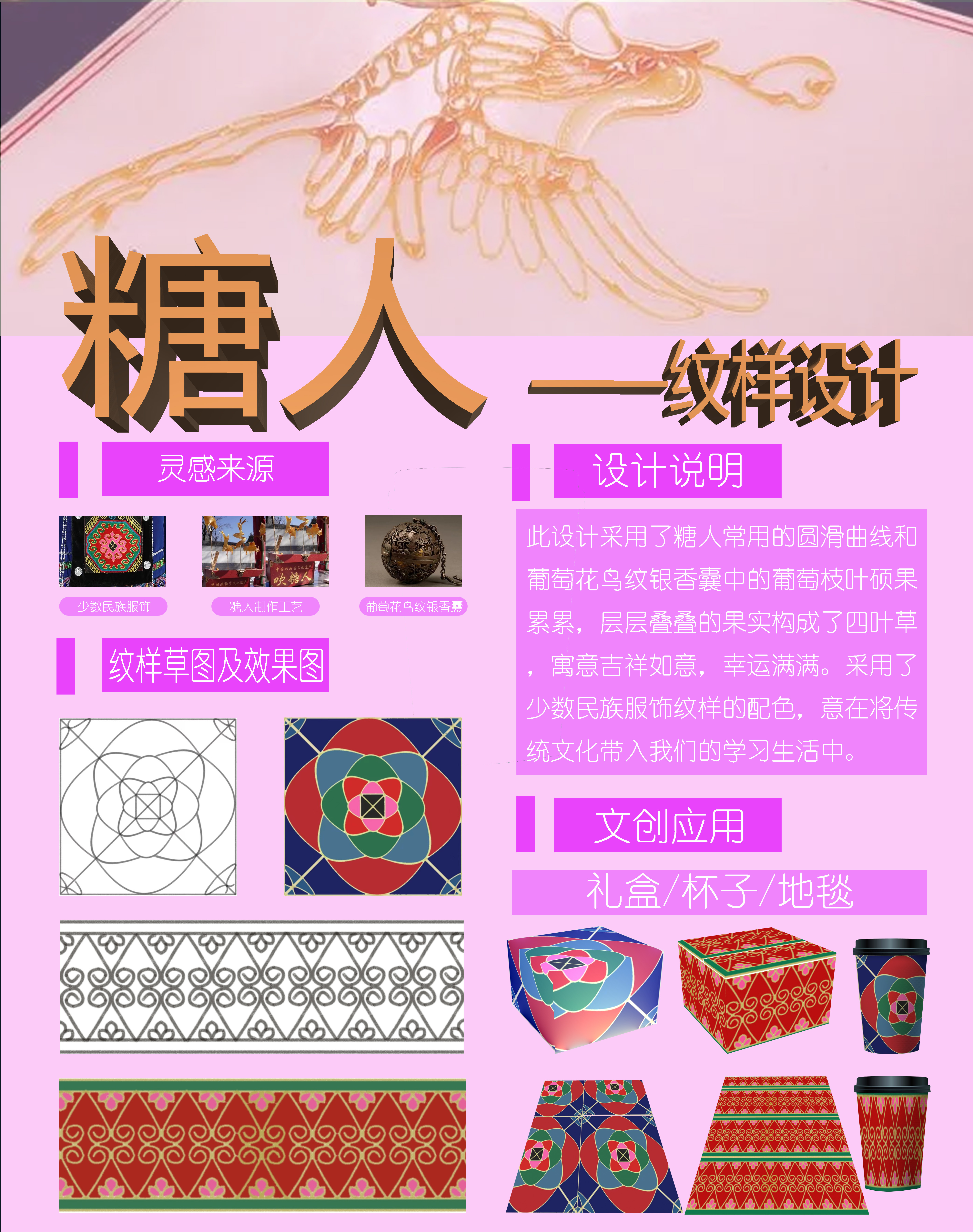 此设计采用了糖人常用的光滑曲线和葡萄花鸟纹银香囊中的葡萄枝叶硕果累累,层层叠叠的果实构成了四叶草,寓意吉祥如意,幸运满满。采用了少数民族服饰纹样的配色,意将传统文化带入我们的学习生活中。