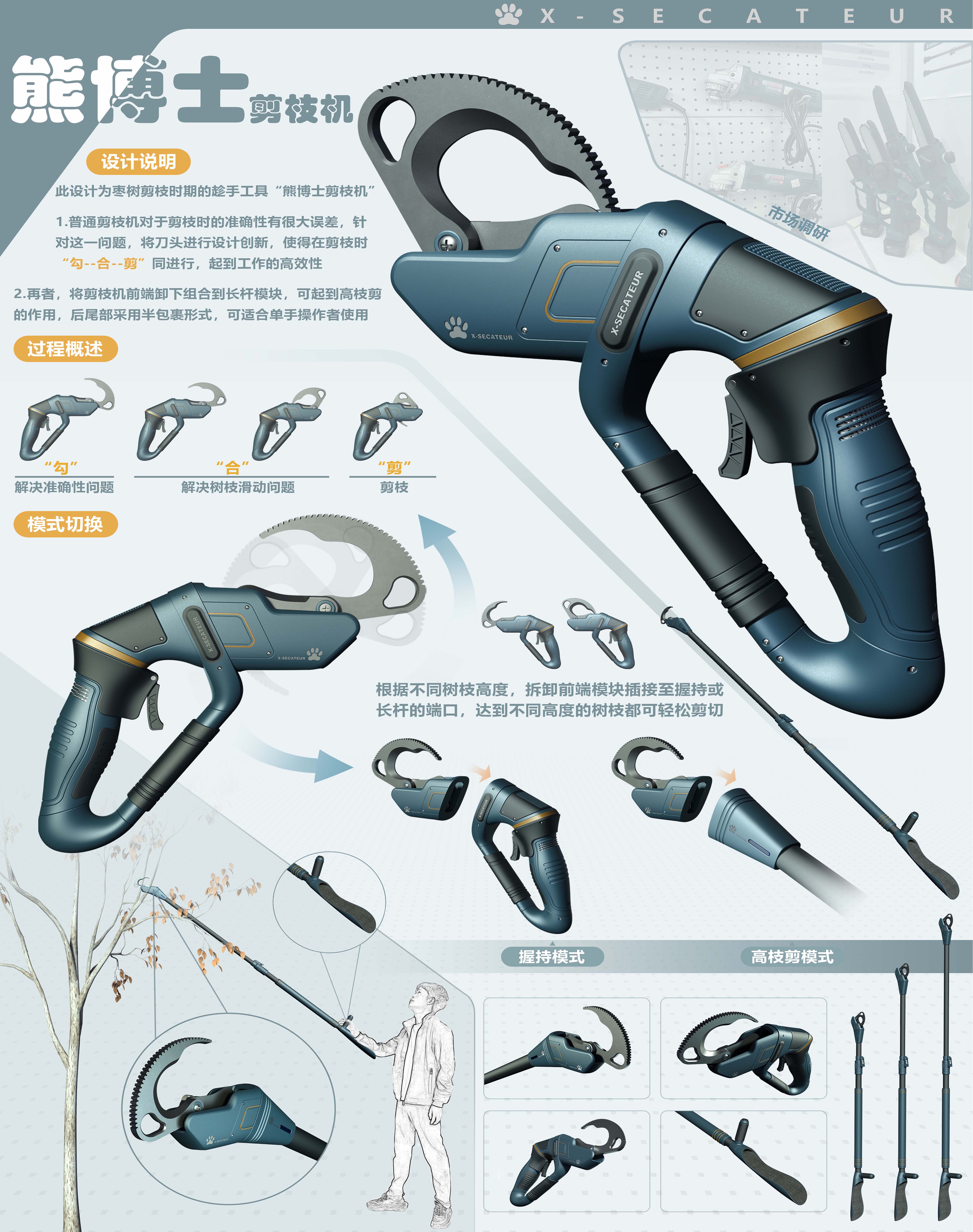 此设计为枣树剪枝时期的趁手工具“熊博士剪枝机” 1.普通剪枝机对于剪枝时的准确性有很大误差,针对这一问题,将刀头进行设计创新,使得在剪枝时”勾--合--剪”同进行,起到工作的高效性。 2.再者,将剪枝机前端卸下组合到长杆模块,可起到高枝真的作用,后尾部采用半包裹形式,可适合单手操作者使用。