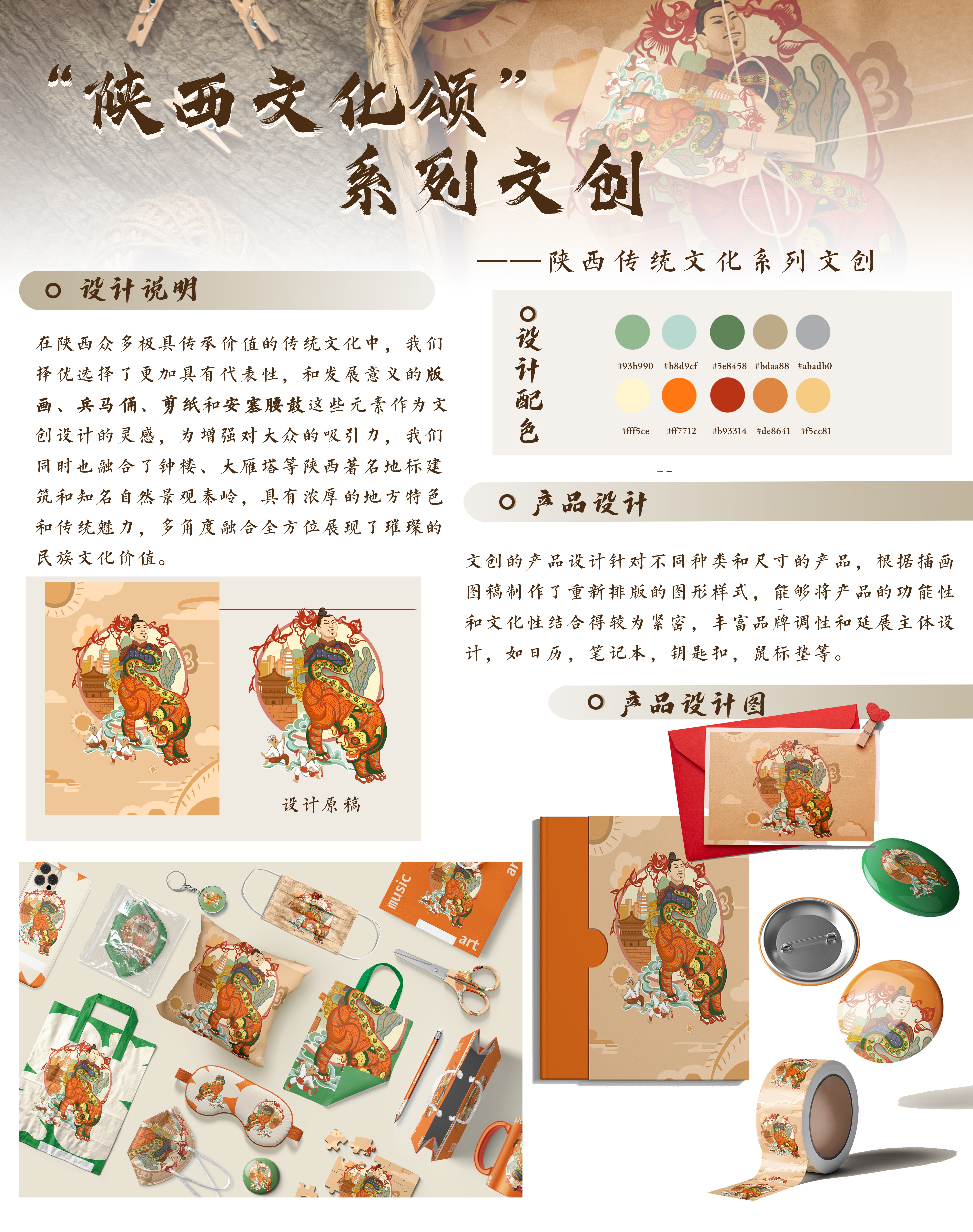 在陕西众多极具传承价值的传统文化中,我们择优选择了更加具有代表性和发展意义的版画、兵马俑、剪纸和安塞腰鼓这些元素作为文创设计的灵感,为增强对大众的吸引力,我们同时也融合了钟楼、大雁塔等陕西著名地标建筑和知名自然景观秦岭,具有浓厚的地方特色和传统魅力,多角度融合全方位展现了璀璨的民族文化价值。针对不同种类尺寸的产品制作了不同的图形样式,将产品的功能性和文化性结合得较为紧密,丰富了品牌调性和主体设计。