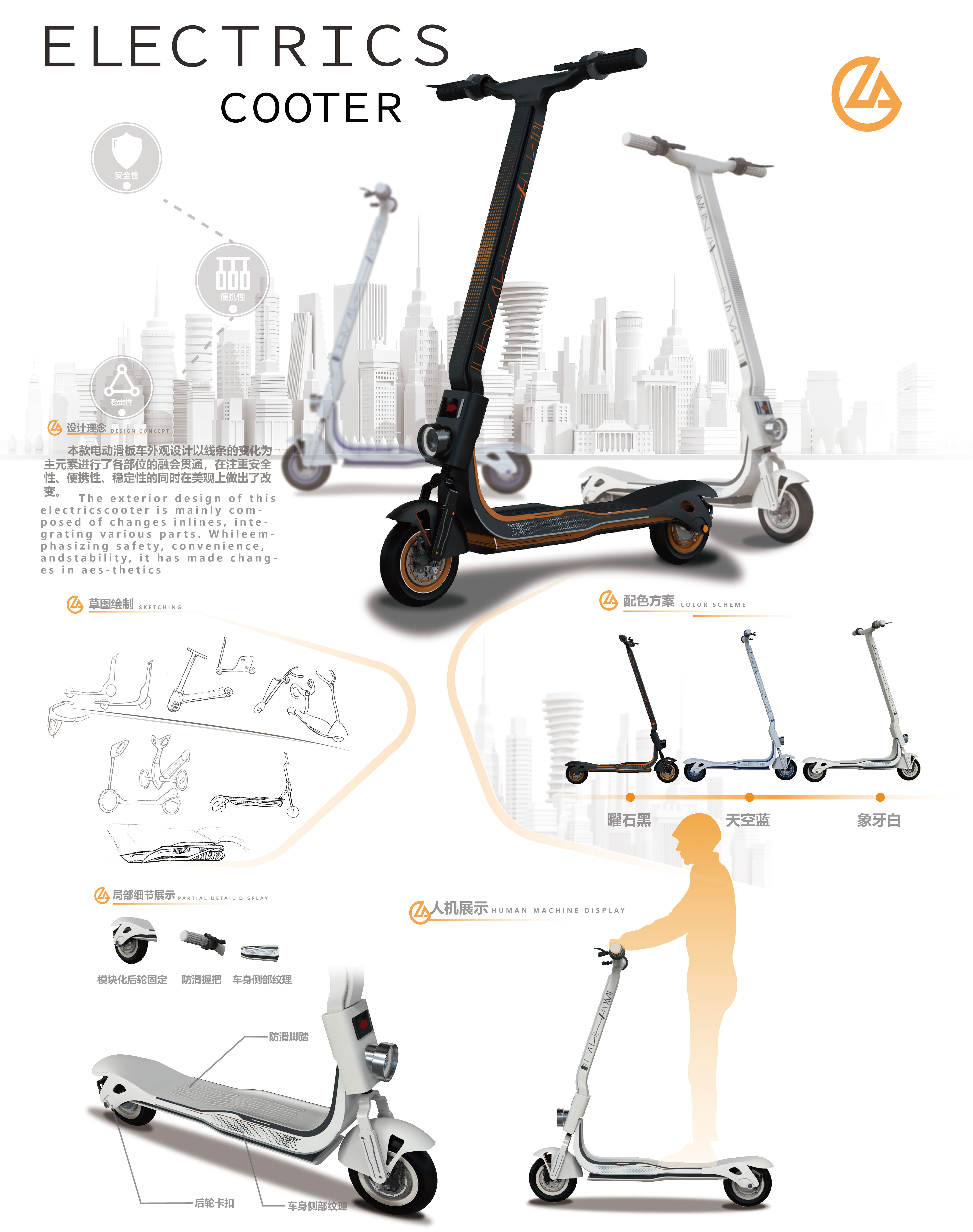 这款电动滑板车以时尚出行,便捷出行为主,为人们在日常生活中出行提供更多时尚的选择,便捷选择;这款电动滑板车设计了三款配色,希望能在广泛的为人们提供更为喜爱的选择