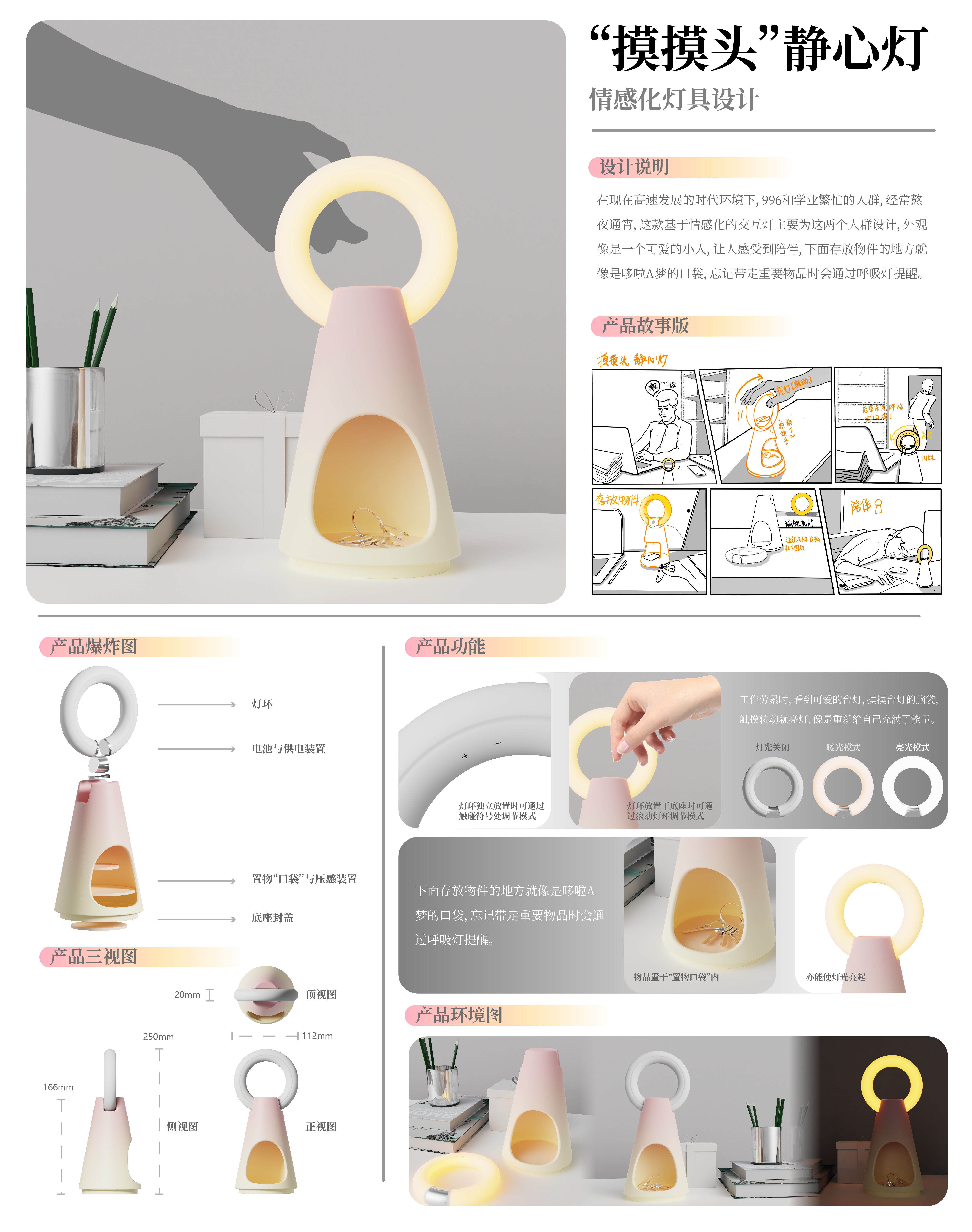 在现在高速发展的时代环境下,996和学业繁忙的人群,经常熬夜通宵,这款基于情感化的交互灯主要为这两个人群设计,外观像是一个可爱的小人,让人感受到陪伴,下面存放物件的地方就像是哆啦A梦的口袋,忘记带走重要物品时会通过呼吸灯提醒。