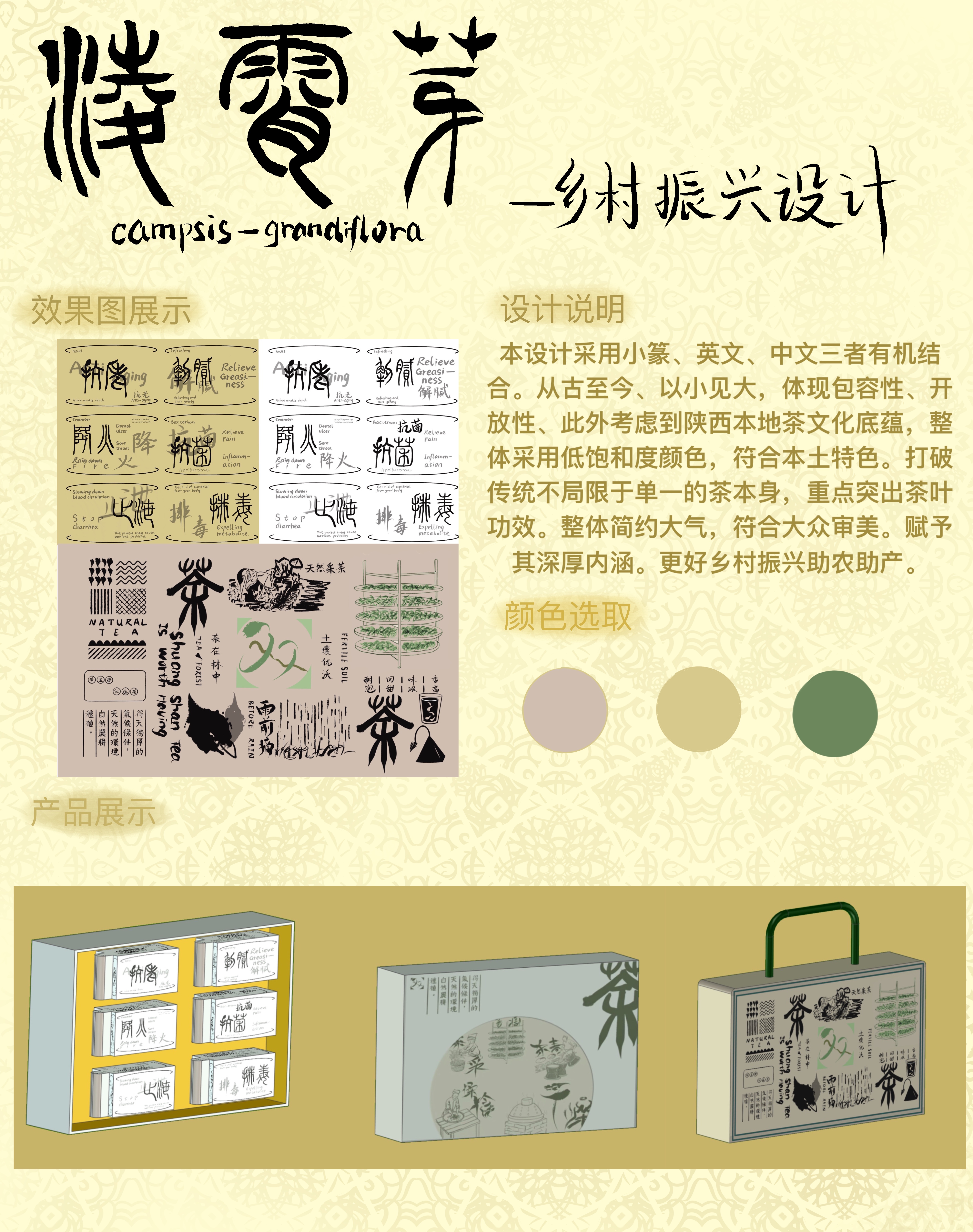 本设计采用小篆、英文、中文三者有机结合。从古至今、以小见大,体现包容性、开放性、此外考虑到陕西本地茶文化底蕴,整体采用低饱和度颜色,符合本土特色。打破传统不局限于单一的茶本身,重点突出茶叶功效。整体简约大气,符合大众审美。赋予其深厚内涵。更好乡村振兴助农助产。