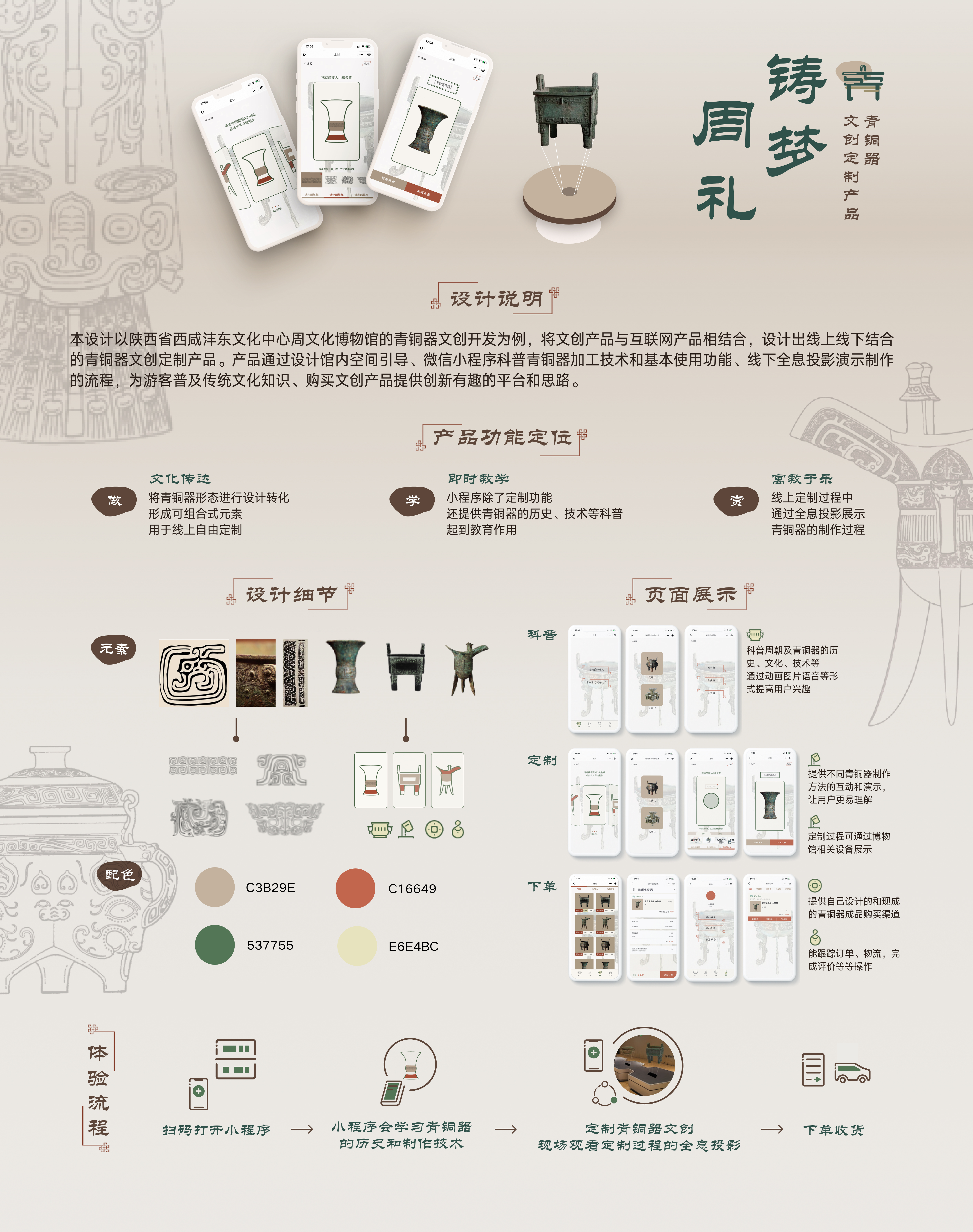 本设计以陕西省西咸沣东文化中心周文化博物馆的青铜器文创开发为例,将文创产品与互联网产品相结合,设计出线上线下结合的青铜器文创定制产品。产品通过设计馆内空间引导、微信小程序科普青铜器加工技术和基本使用功能、线下全息投影演示制作的流程,为游客普及传统文化知识、购买文创产品提供创新有趣的平台和思路。