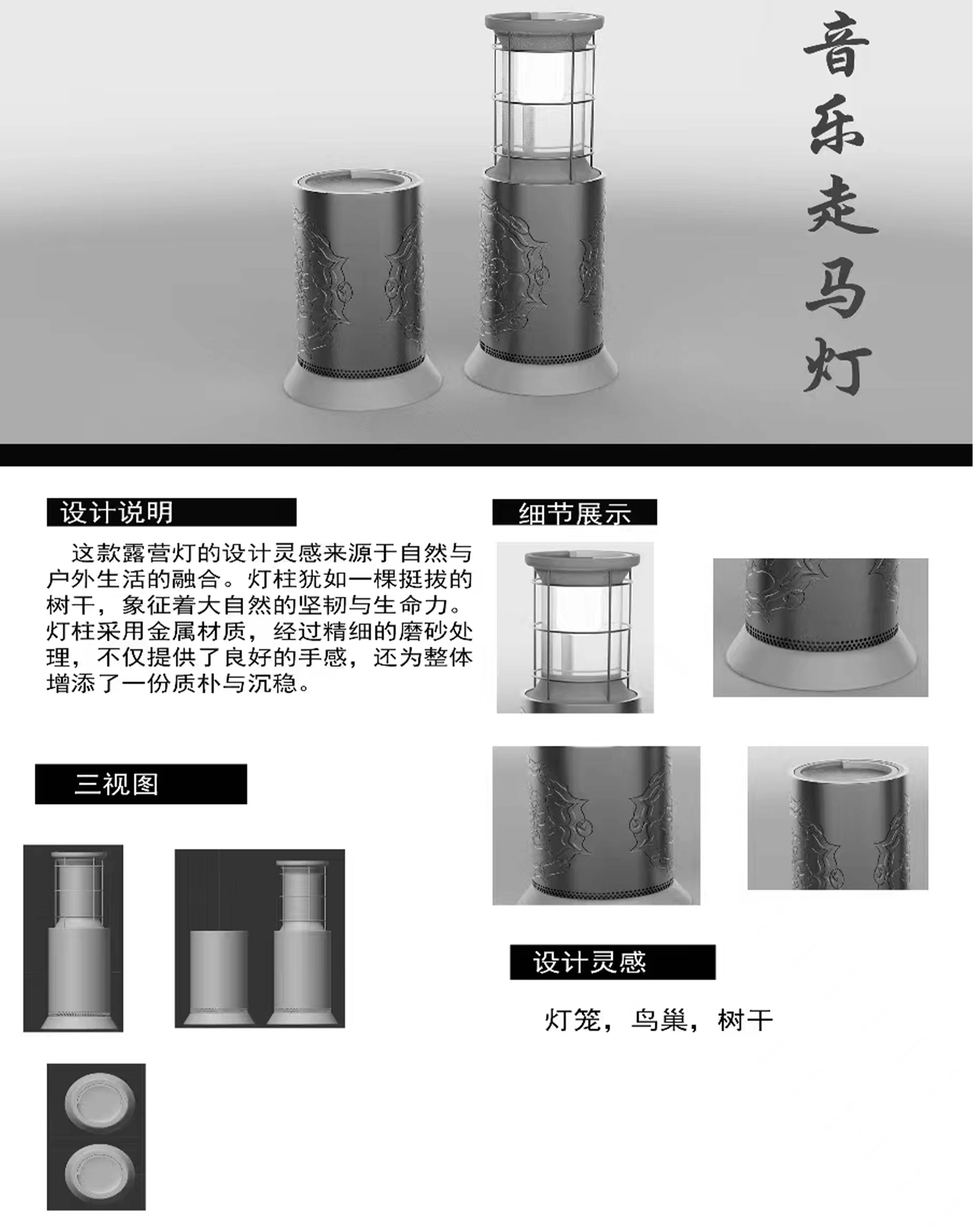 这款露营灯的设计灵感来源于自然与户外生活的融合。灯柱犹如一棵挺拔的树干,象征着大自然的坚韧与生命力。灯柱采用金属材质,经过精细的磨砂处理,不仅提供了良好的手感,还为整体增添了一份质朴与沉稳。 灯罩的设计灵感来源于鸟巢,象征着家的温暖与宁静。采用织物材料,具有轻便与透光的特性,能够有效地散发出柔和的光芒。灯罩表面雕刻有精美的花纹,仿佛是鸟儿精心编织的巢穴,细致入微,富有自然韵味。