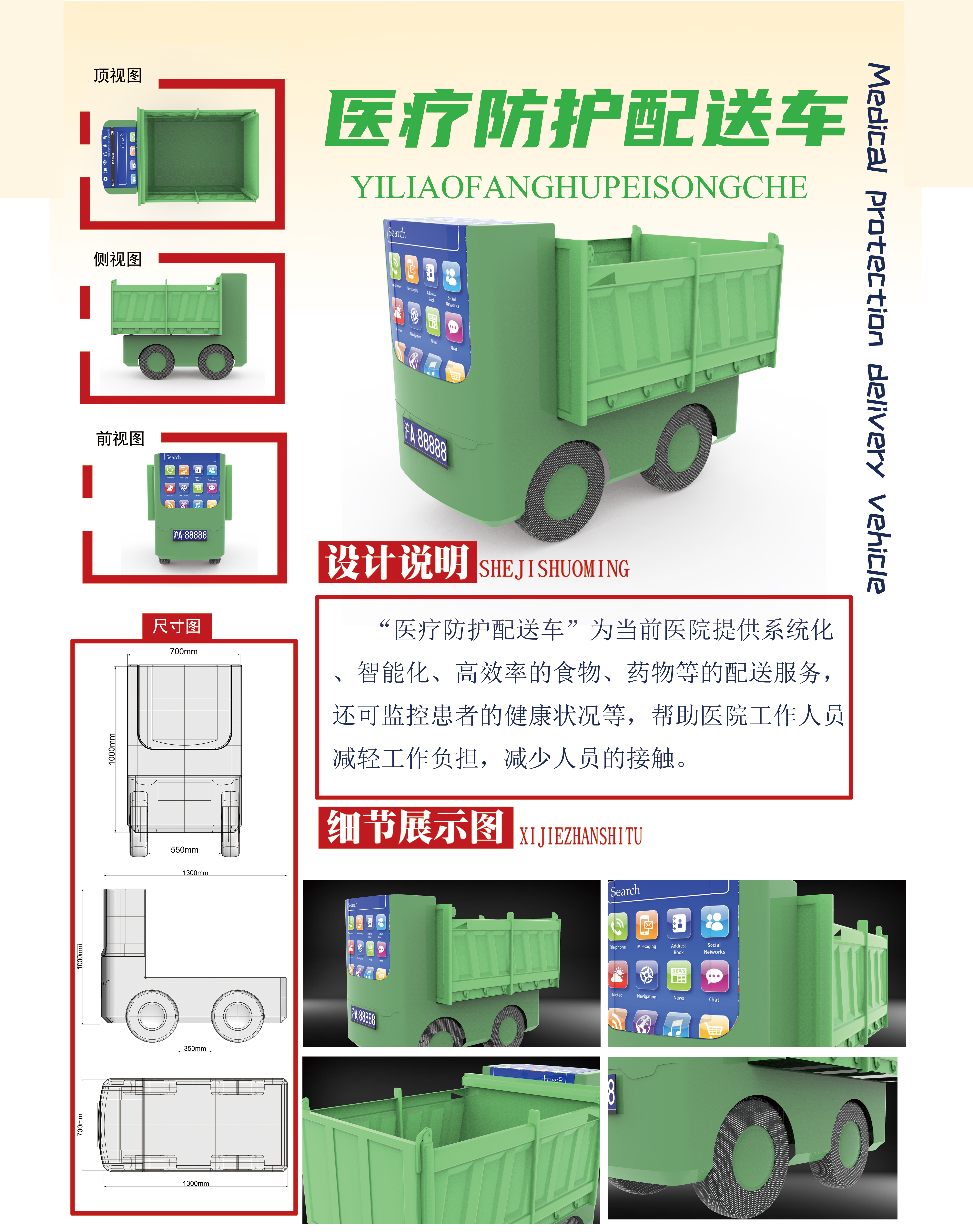 “医疗防护配送车”为当前医院提供系统化智能化、高效率的食物、药物等的配送服务还可监控患者的健康状况等,帮助医院工作人员减轻工作负担,减少人员的接触。