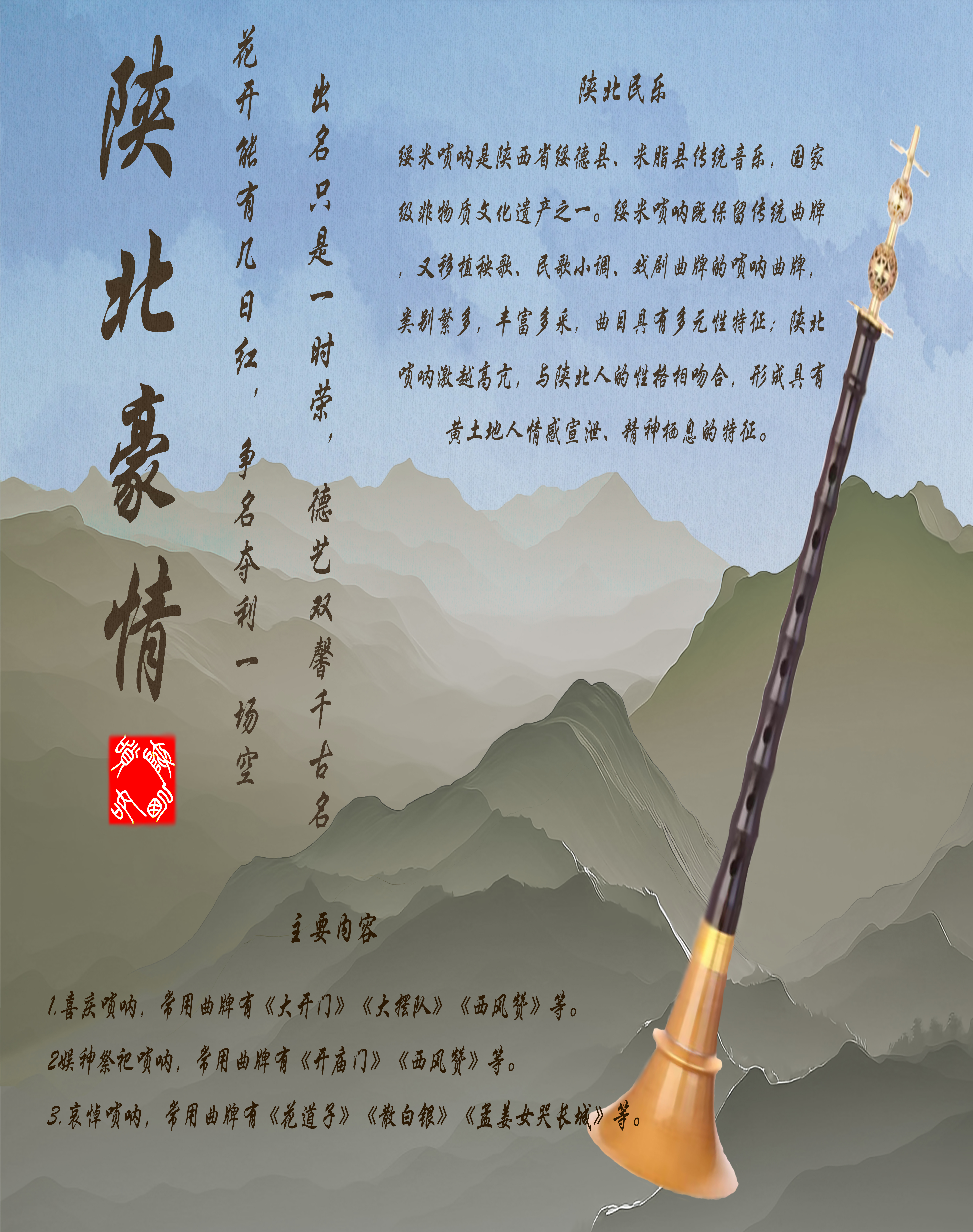 陕北大吹是唢呐的一种流派,就是常说的中音唢呐。由于陕西人民独特的生存方式和文化心理使唢呐拥有高昂嘹亮且粗犷深沉的乐音,成为人们宣泄感情的载体。让人们了解陕西的传统乐器和人文精神,使陕西文化全国传播。