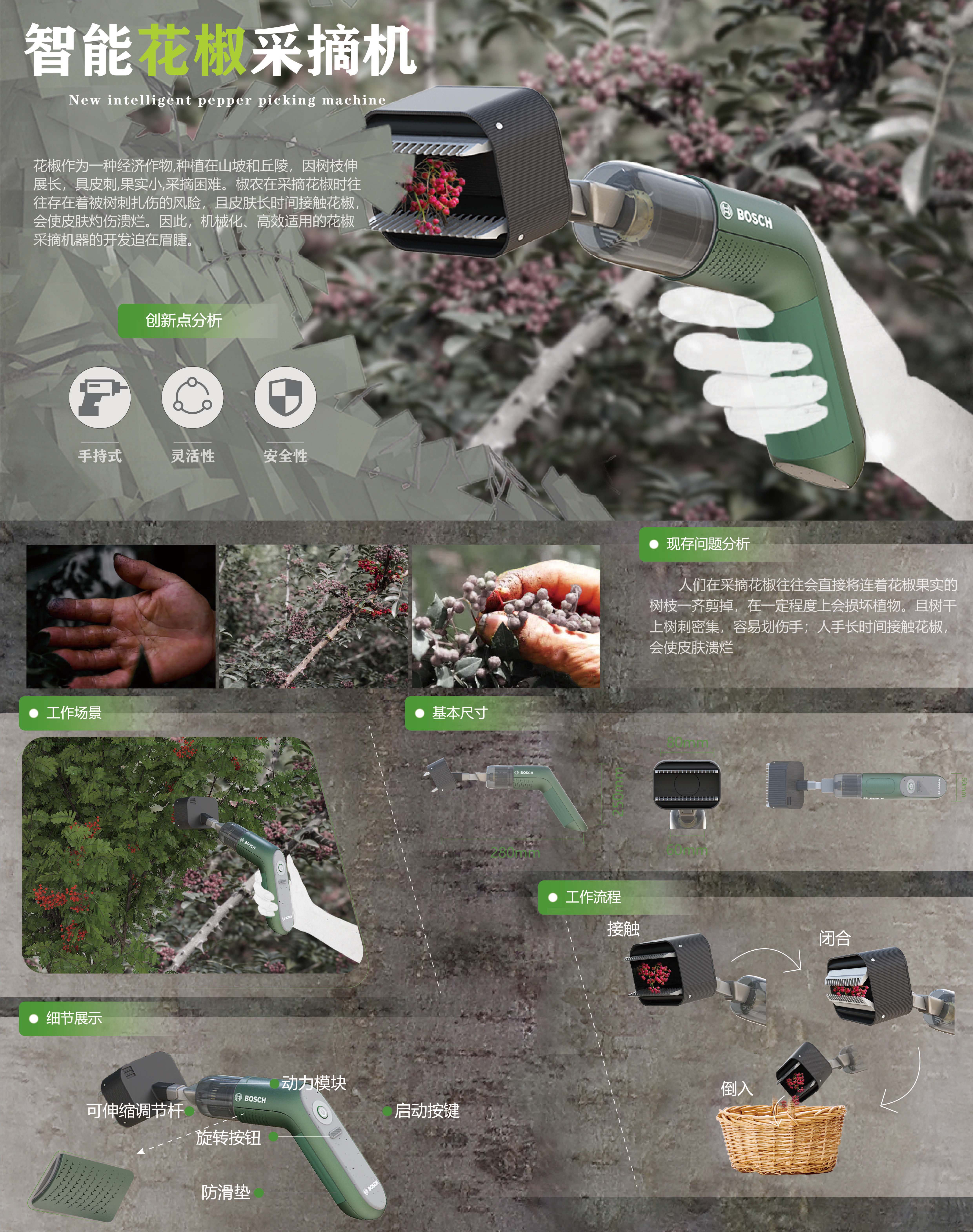 花椒作为一种经济作物,种植在山坡和丘陵,因树枝伸展长。具皮刺,果实小,采摘困难。椒农在采摘花椒时往往存在着被树刺扎伤的风验。且皮肤长时间接触花椒会使皮肤灼伤溃烂。因此,机械化、高效适用的花横采摘机器的开发迫在眉睫。人们在采掖花椒往往会直接将连着花权果实的树枝一齐剪掉,在一定程度上会损坏植物。且树干上树刺容集,容易动伤手; 人手长时间接触花椒,会使皮肤渍烂。