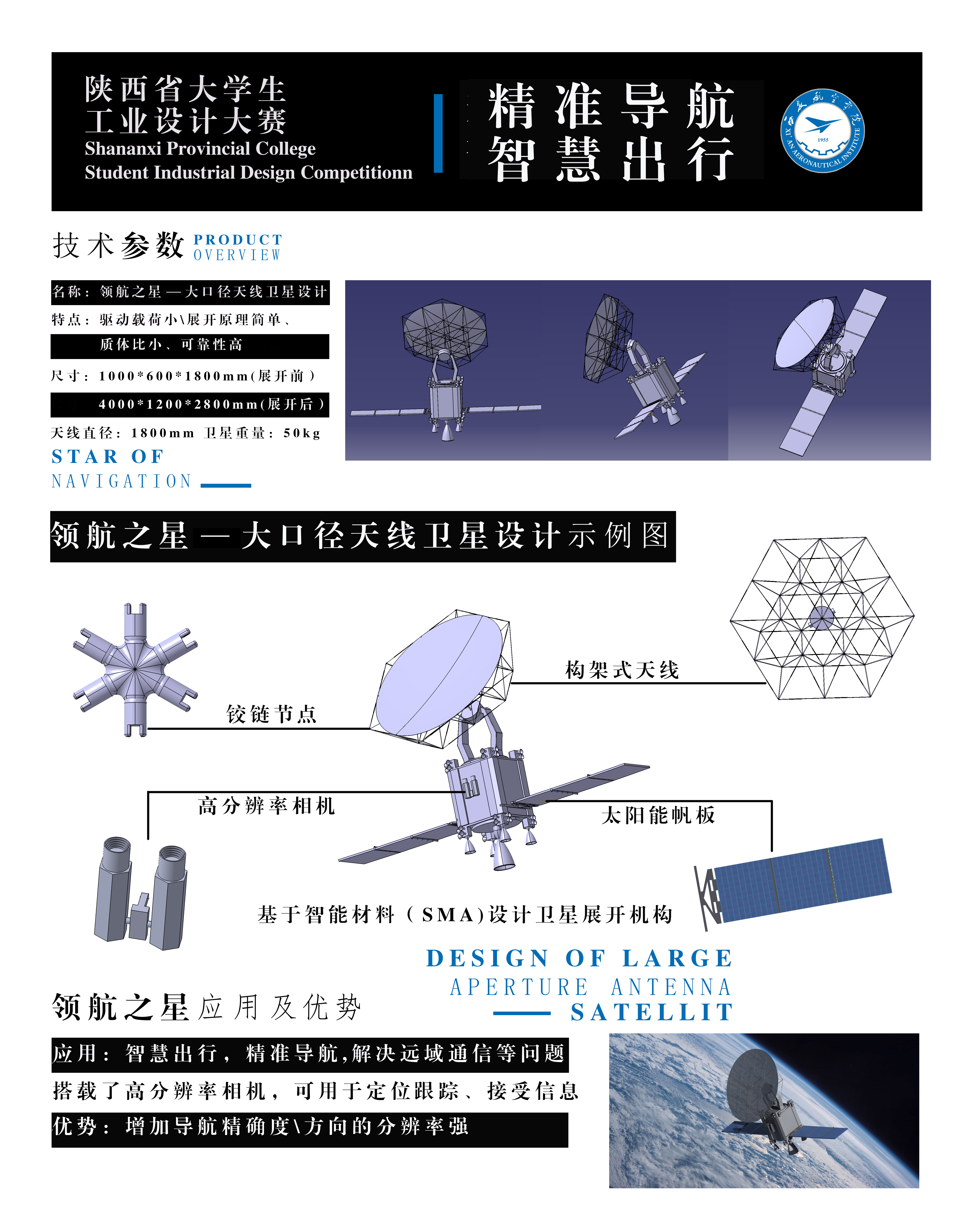主题:围绕智慧出行为主题,将卫星与导航相结合。 结构:搭载大口径天线,增益高,高方向分辨率,强定向性,天线和太阳能帆板连接处铰链采用SMA智能材料,具有形状记忆特性、抗腐蚀等诸可以实现天线和太阳能帆板的智能展开,从而达到卫星整体的空间智能展开效果;此外还搭载了高分辨率相机,可以用于定位跟踪、接收信息,让卫星能更好的为导航精准定位服务提供了一层坚实的保障。