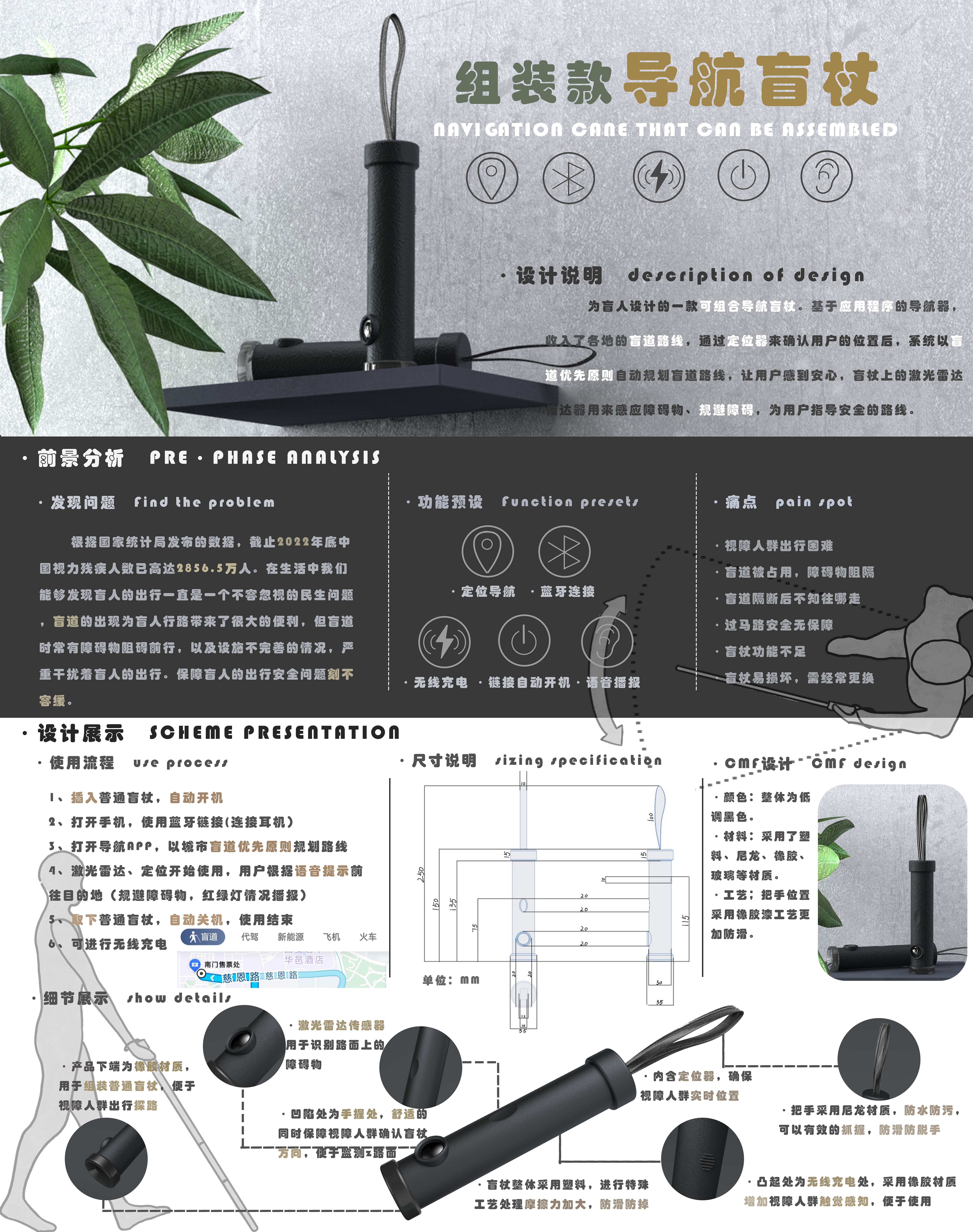 组装款导航盲杖是一款为盲人设计导航工具。基于应用程序的导航器,收入了各地的盲道路线,通过定位器来确认用户的位置后,系统以盲道优先原则自动规划盲道路线,让用户感到安心,盲杖上的激光雷达传达器用来感应障碍物,为用户指导安全的路线。