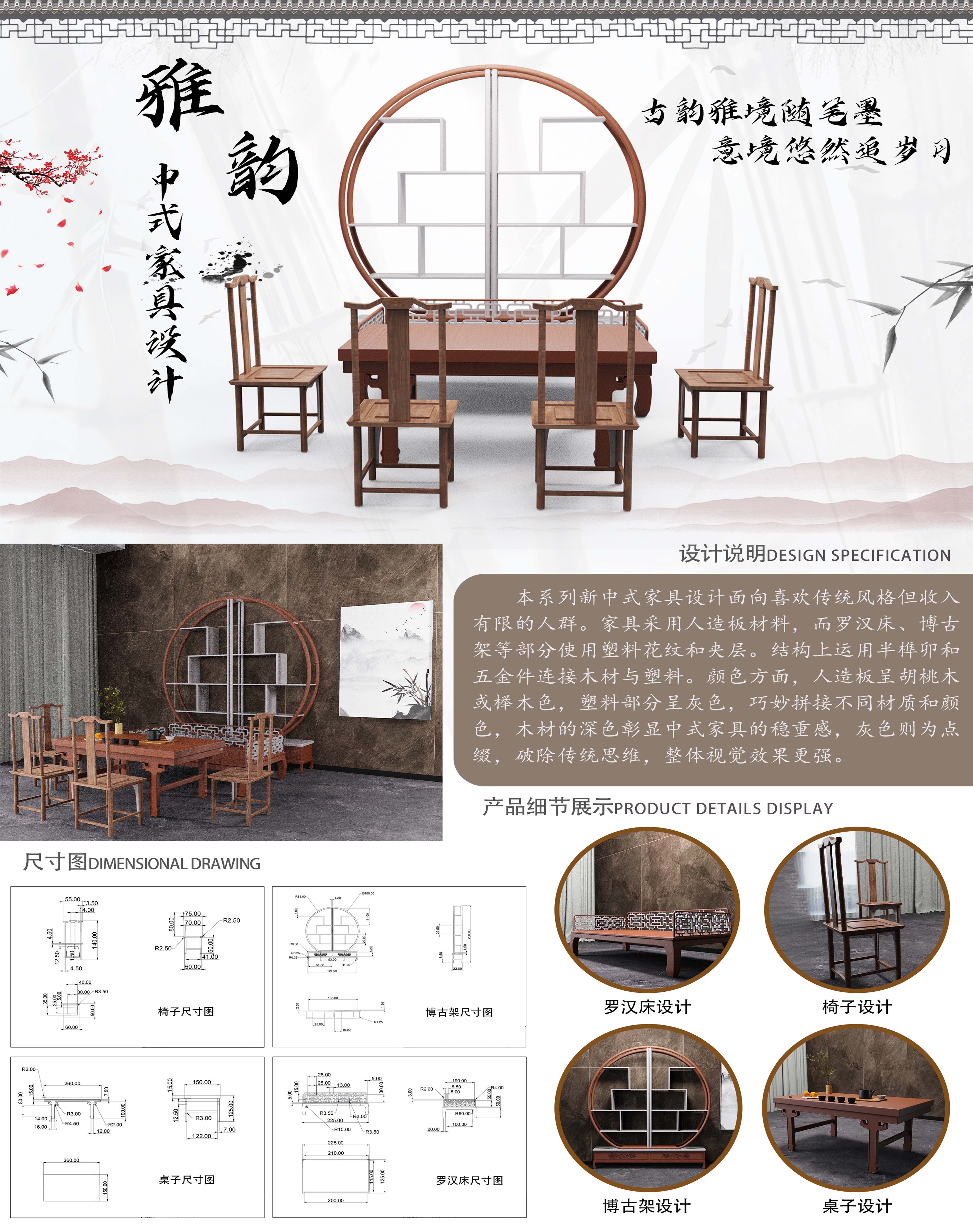 本系列新中式家具主要针对于喜爱传统家具但收入不高的人群进行设计,家具大体的材质采用人造板,而其中罗汉床的花纹、博古架的置物台、桌子夹层等均用塑料材质拼装;结构上主要采用半榫卯结构,木材与木材之间均采用榫卯结构还原传统家具连接工艺,而木材与塑料之间采用采用五金件进行连接;在色彩上,人造板的色彩主要采用胡桃木色或榉木色,塑料的颜色采用灰色进行拼接,而灰色的部分进行点缀,使得家具整体视觉冲击更强。