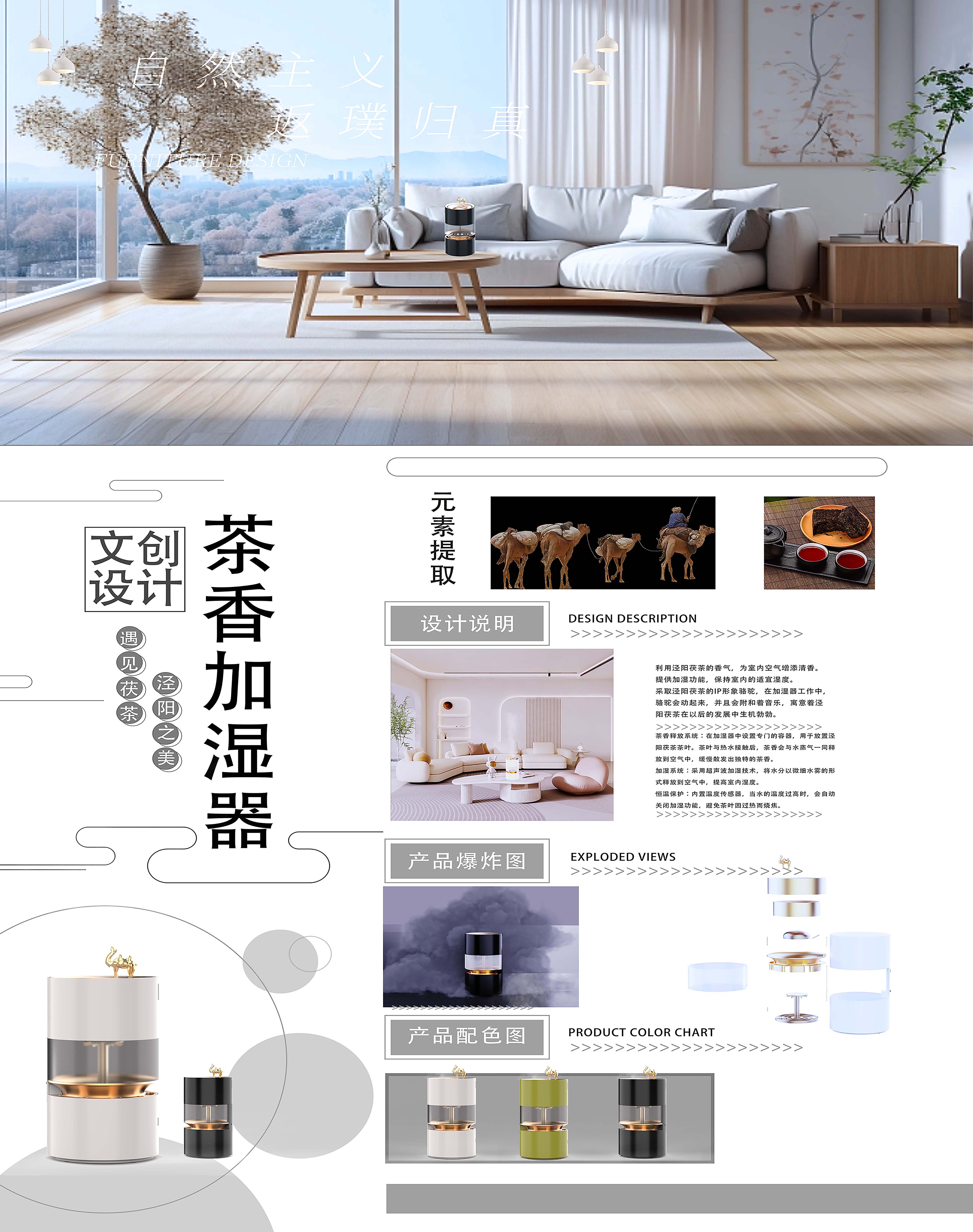 利用泾阳获茶的香气,为室内空气增添清香,提供加湿功能,保持室内的适宜湿度。在加湿器工作中 骆驼会动起来,并且会附和着音乐,寓意着泾 阳获茶在以后的发展中生机勃勃。 设计滑动开关,简单明了,方便用户控制加湿和茶香功能的开关。 提供自动关机功能,在水箱水位过低或工作时间过长时,自动关闭加湿器,以防止干烧损坏。 设计透明的水箱,方便用户观察和添加水。