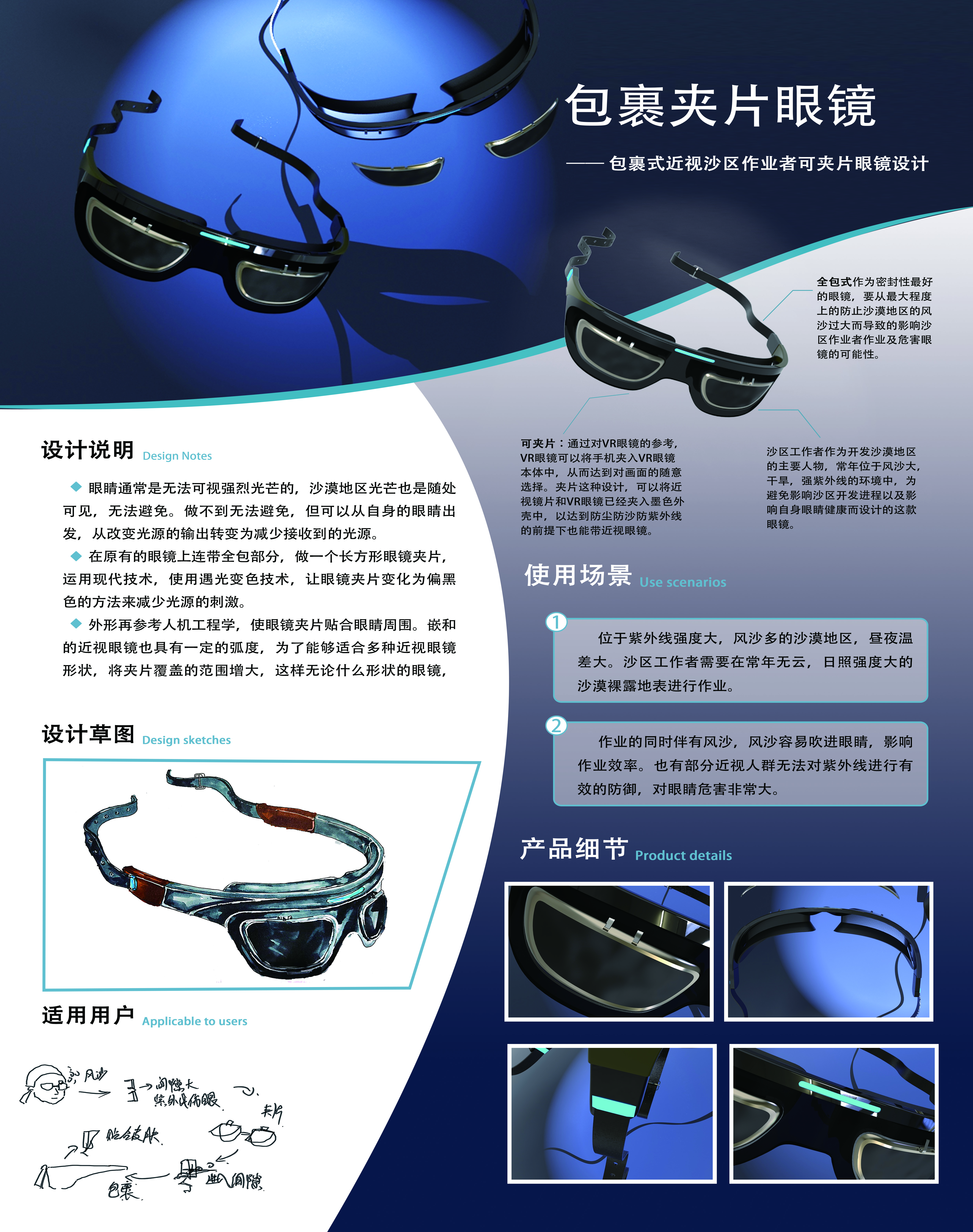 眼睛通常是无法可视强烈光芒的,沙漠地区光芒也是随处可见,无法避开,但可以从自身的眼睛出发,从改变光源的输出转变为减少接收到的光源。在原有的眼镜上连带全包部分,做一个长方形眼镜夹片,使用遇光变色技术,让眼镜夹片变化为偏黑色的方法来减少光源的刺激。外形再参考人机工程学,使眼镜夹片贴合眼睛周围。嵌和的近视眼镜也具有一定的弧度,为了能够适合多种近视眼镜形状,将夹片覆盖的范围增大,这样无论什么形状的眼镜,